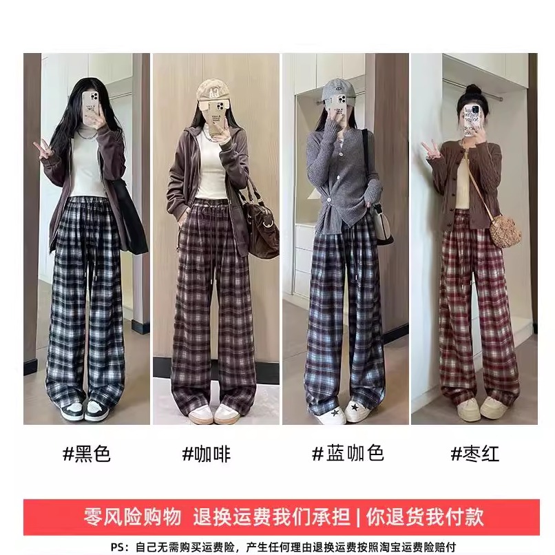 高腰慵懒宽松加厚加绒长裤 美式 2025新款 女秋季 复古格子直筒阔腿裤