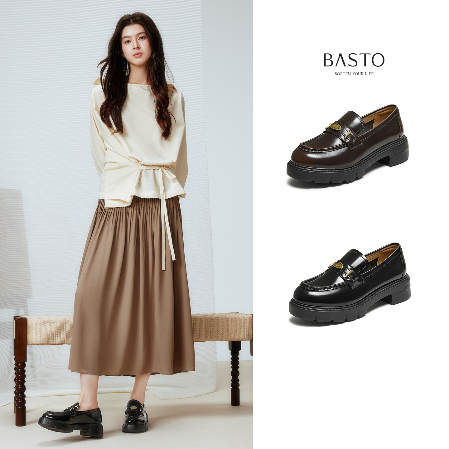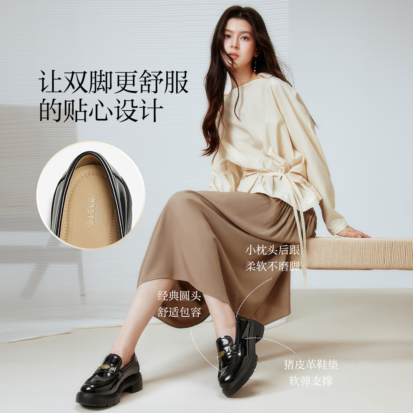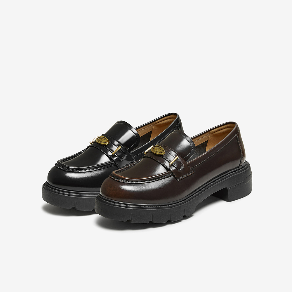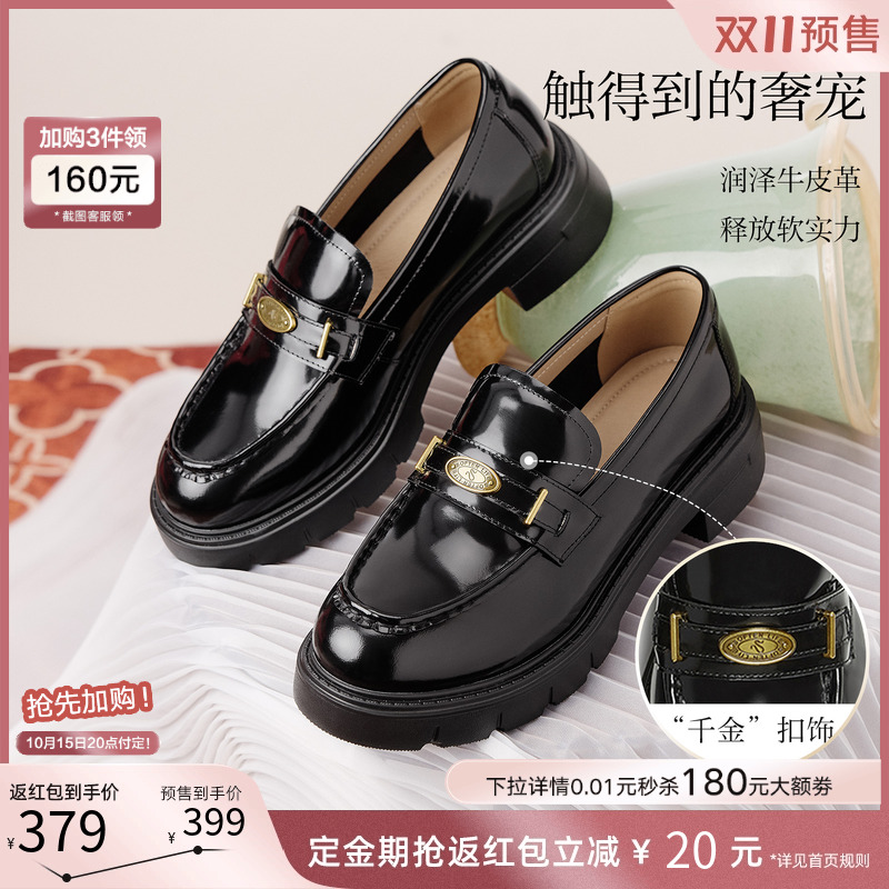 学院风粗跟女单鞋 乐福鞋 UUJ01CA5 商场新款 双11预售百思图2025秋季