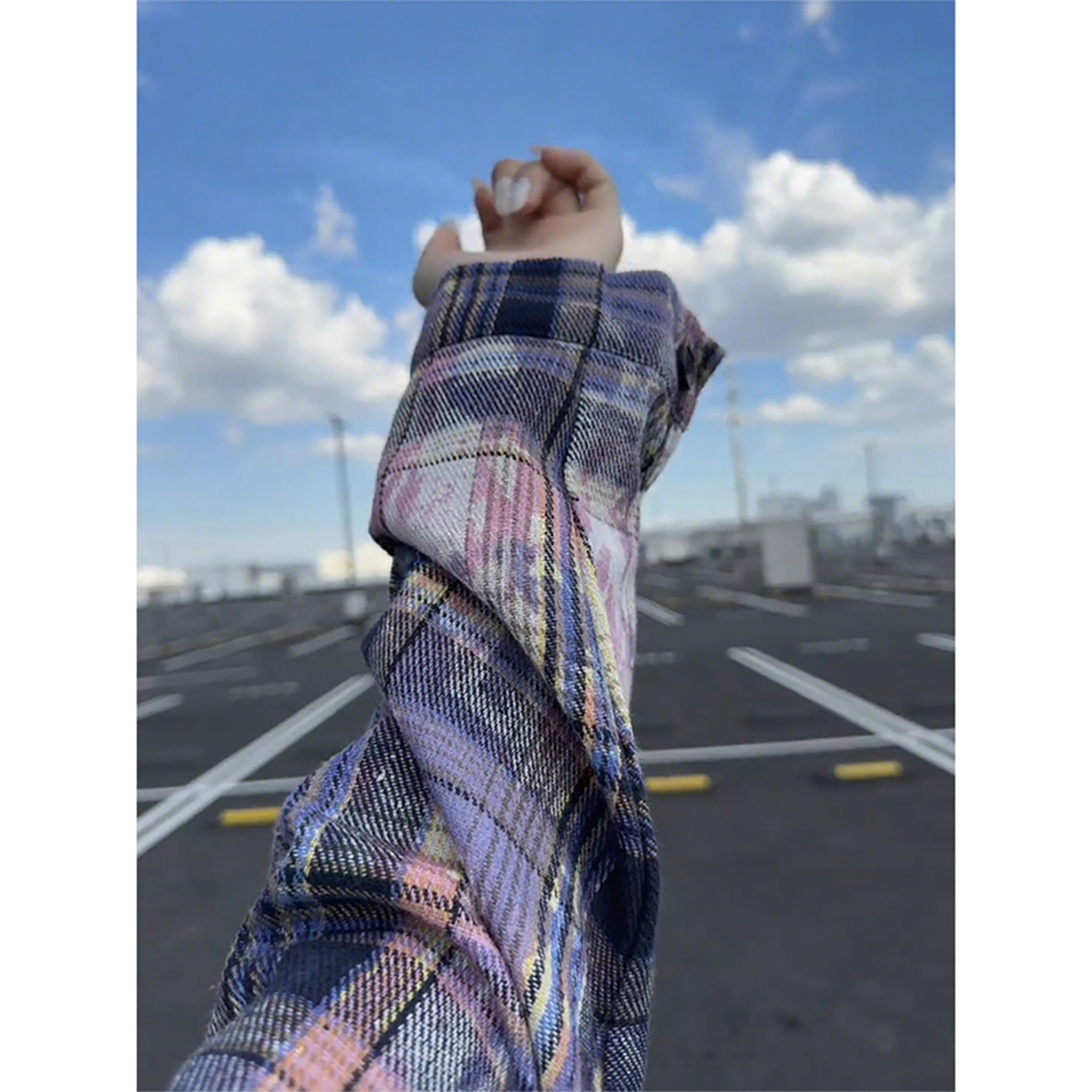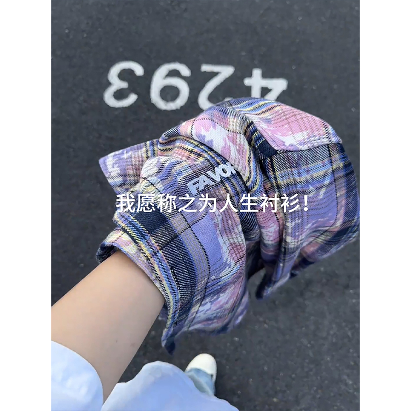 高街潮牌格纹设计感衬衣痞帅薄款 美式 外套 男秋季 紫色扎染格子衬衫