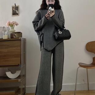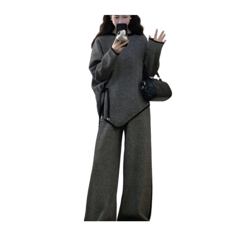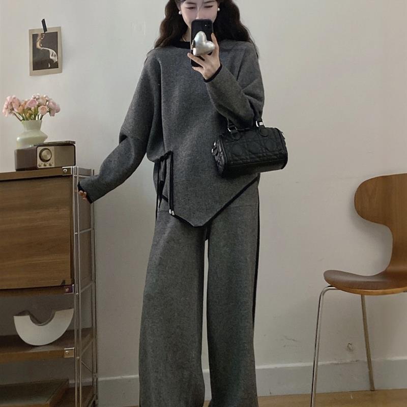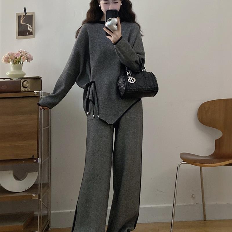 春秋胖mm显瘦遮肚休闲设计感针织打底上衣阔腿裤 女装 子两 大码 新品