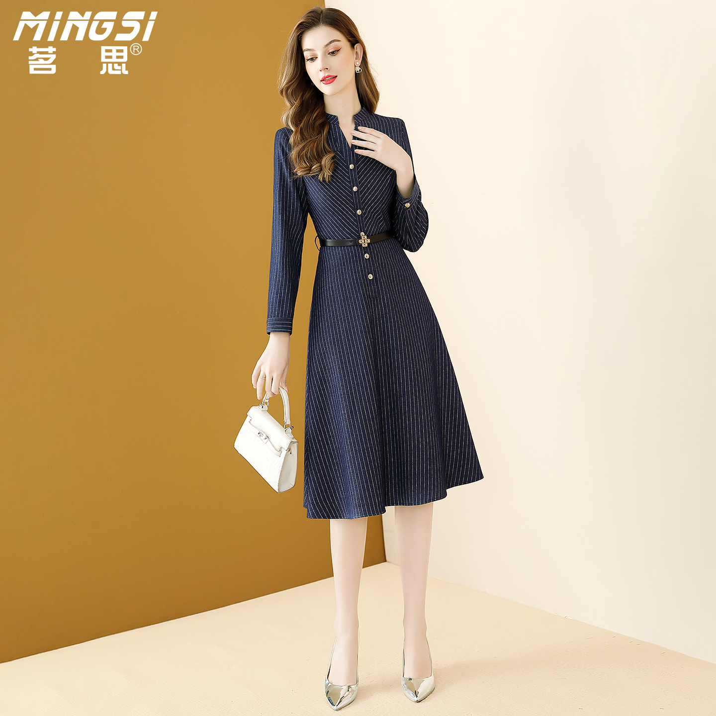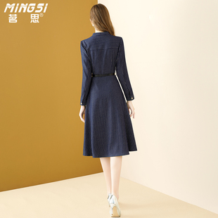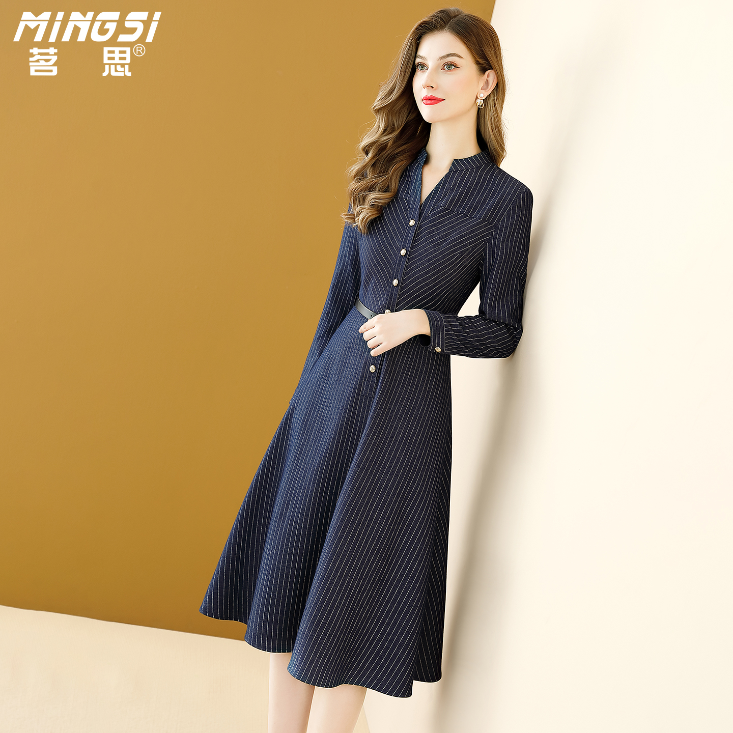 裙子 气质通勤收腰显瘦衬衫 茗思设计感条纹V领连衣裙2025秋装 新款