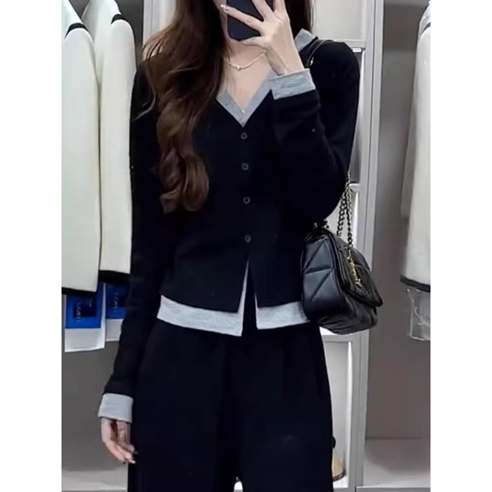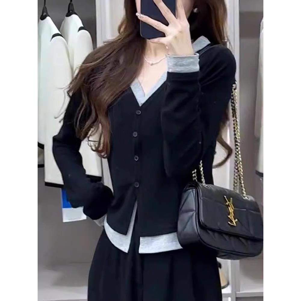 内搭打底衫 修身 显瘦针织开1007r T恤女新款 秋冬黑色假两件V领长袖