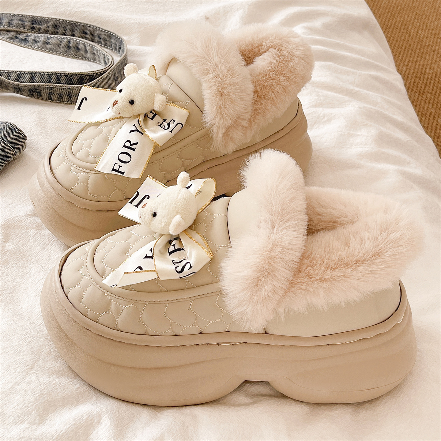 室内外穿防滑加绒保暖可爱小熊包跟棉鞋 厚底增高防水棉拖鞋 女冬季
