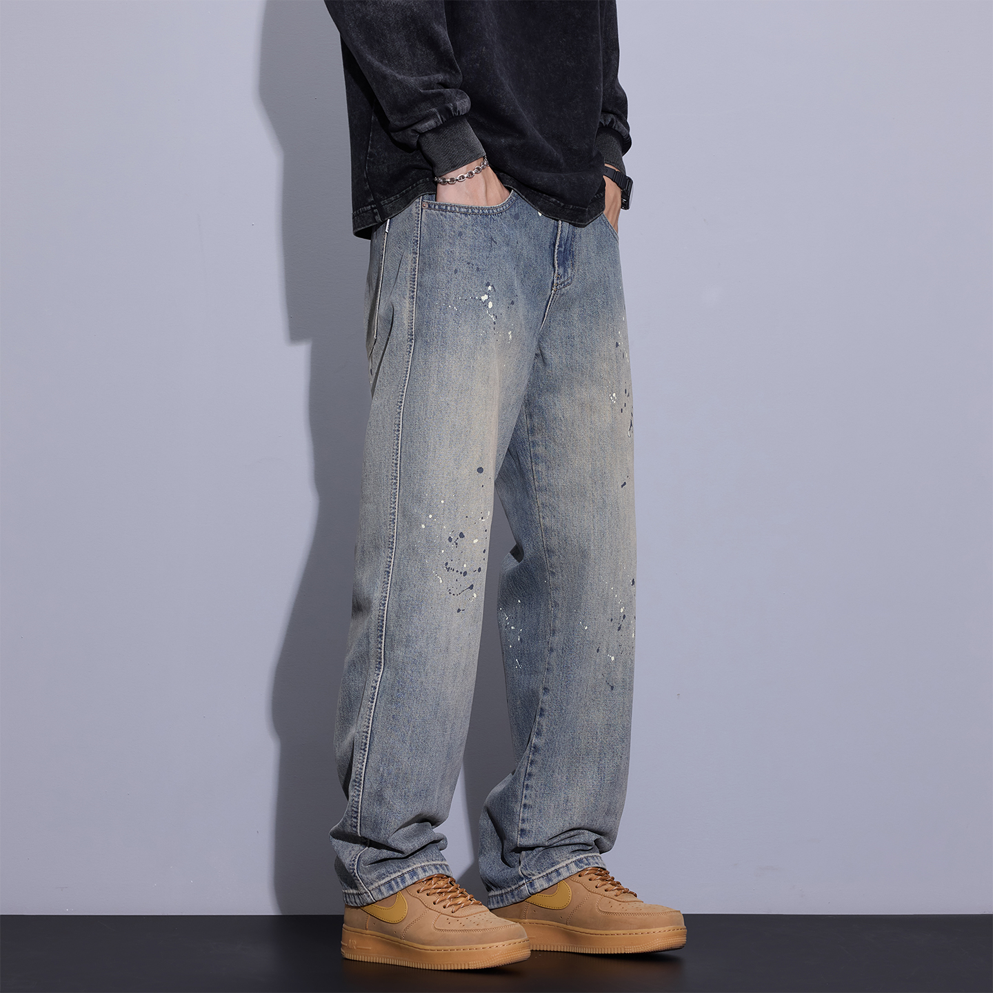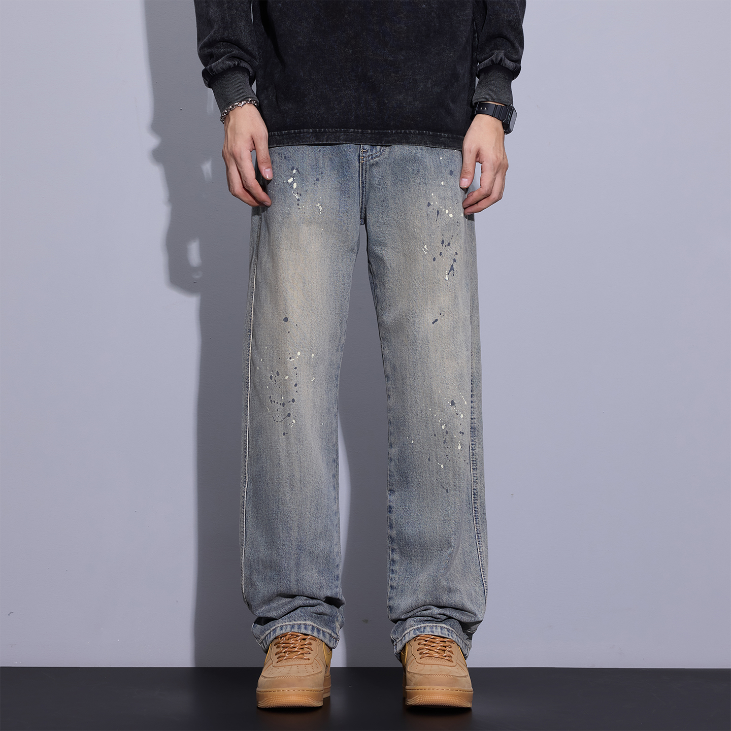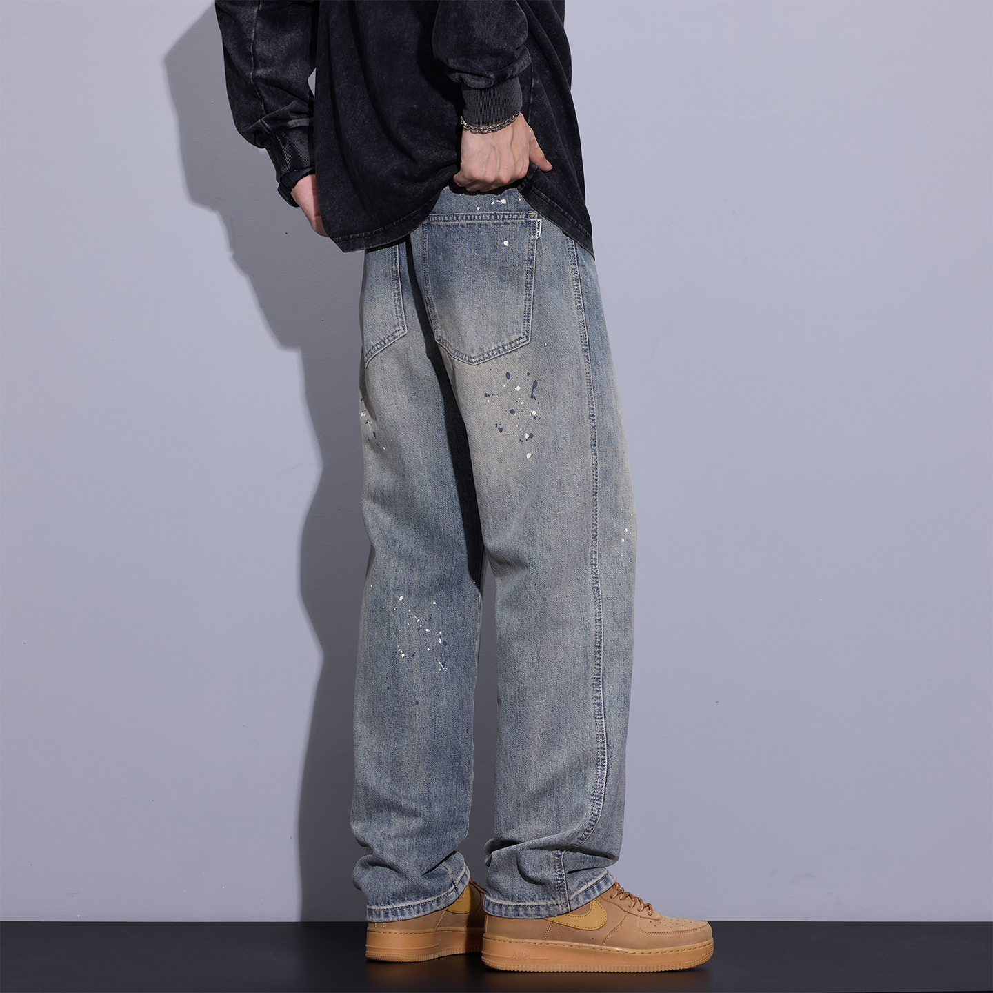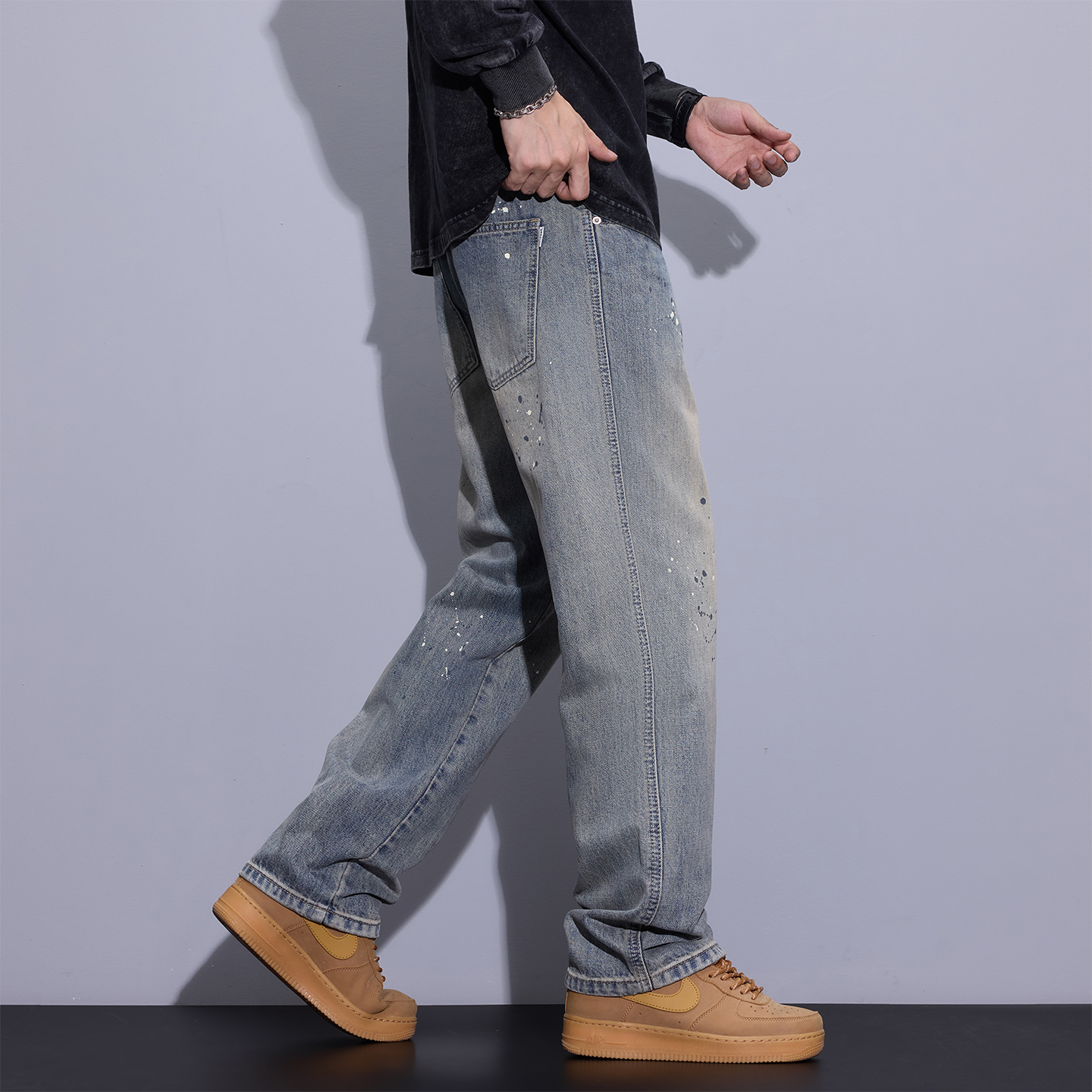 新款 秋季 男士 美式 子 回力黑色牛仔裤 复古阔腿宽松直筒休闲长裤 男款