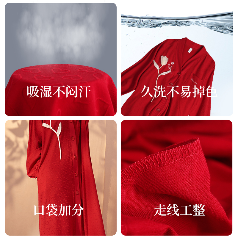 红色睡袍睡衣大码 纯棉长袖 结婚家居服晨袍 睡裙女春秋季 轩靓新中式