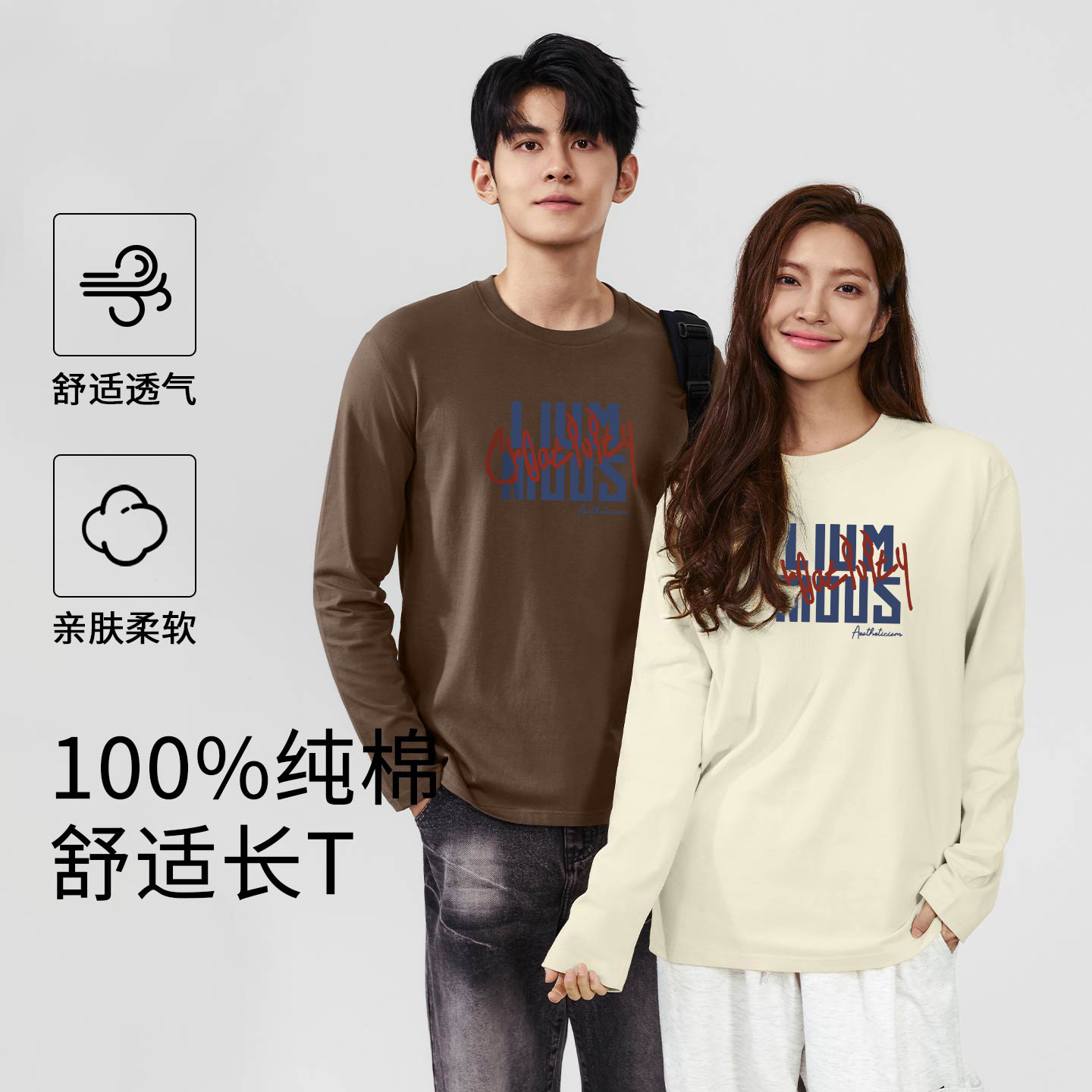 圆领长袖 外穿圆领宽松体恤衫 t恤男秋季 纯棉男士 新款 班尼路美式