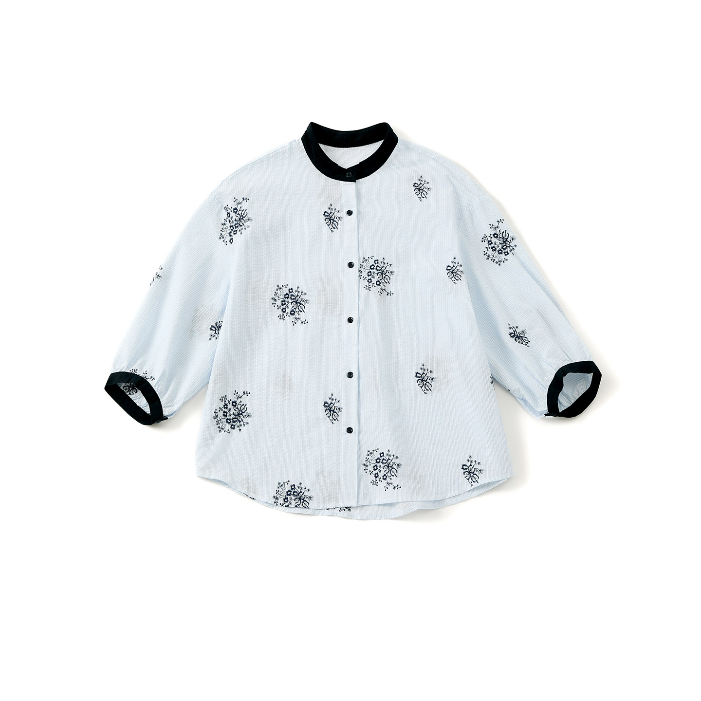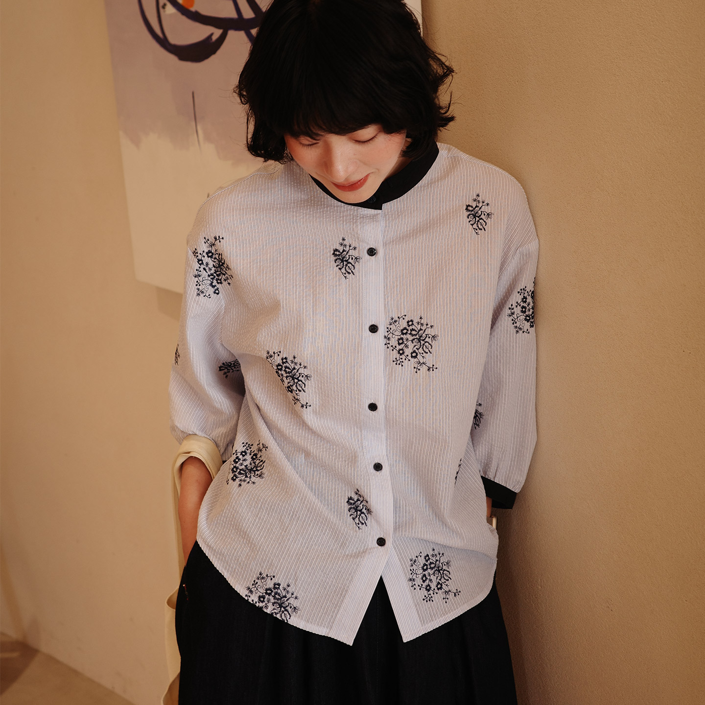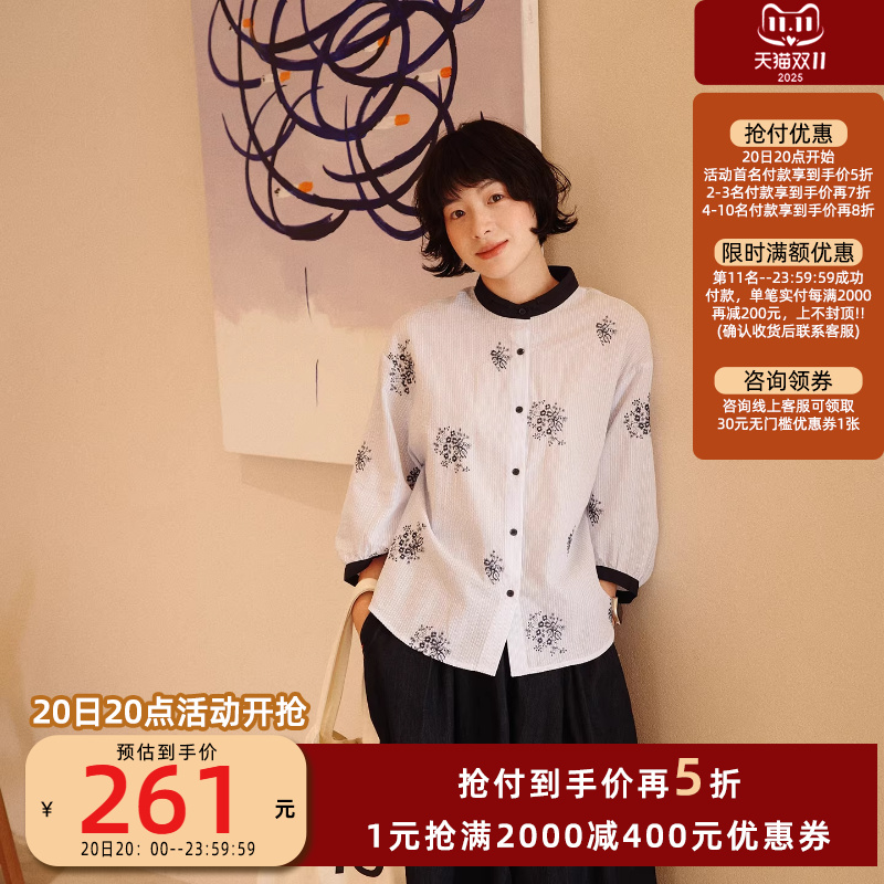女显瘦休闲小衫 非鱼2025秋装 衬衫 刺绣圆领七分袖 通勤复古上衣 新款