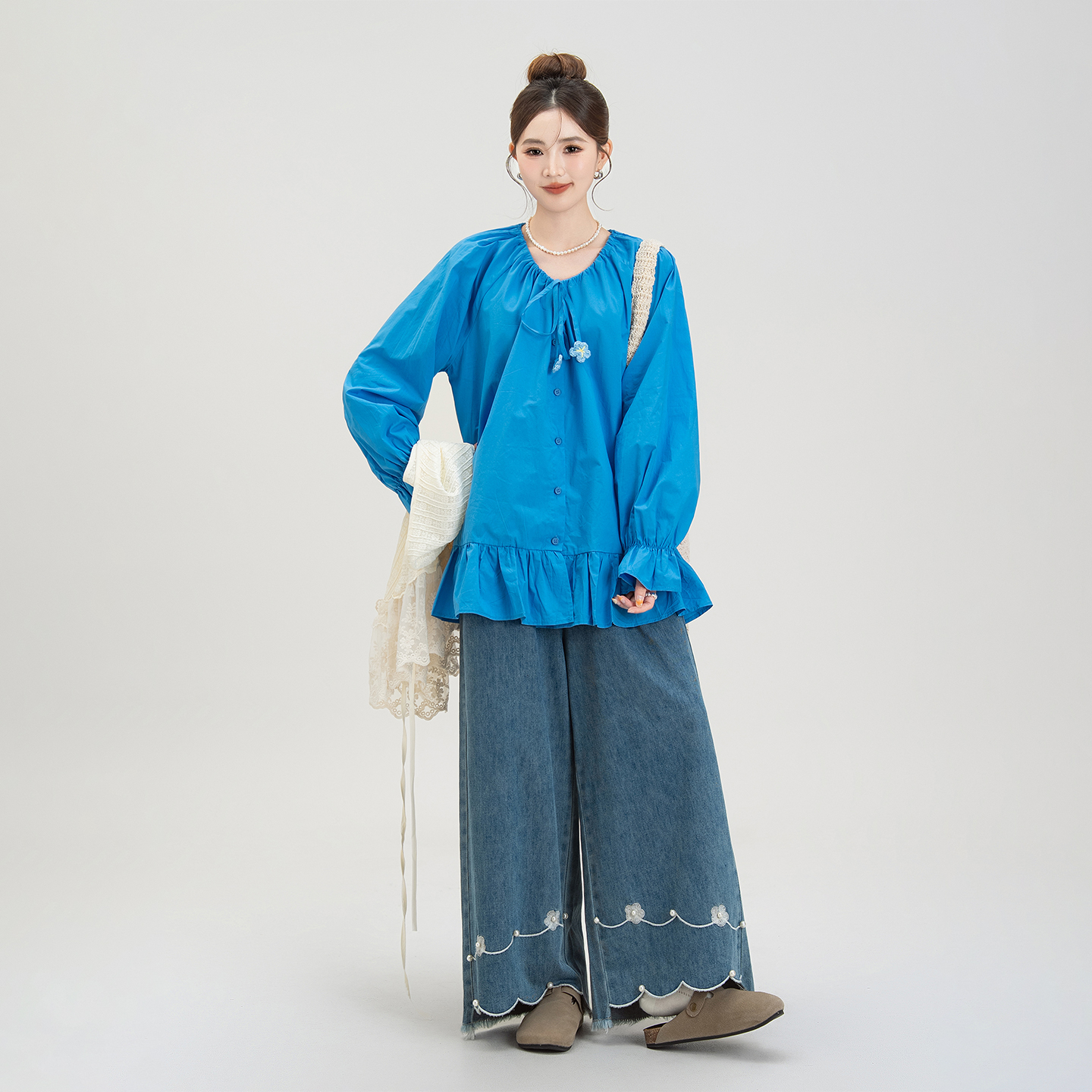 套装 蓝色荷叶花边拼接长袖 叠穿蕾丝马甲牛仔阔腿裤 女早秋新款 衬衫