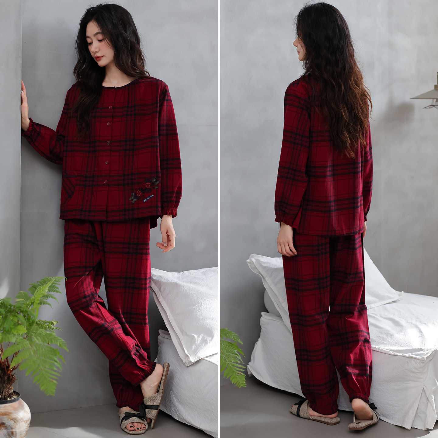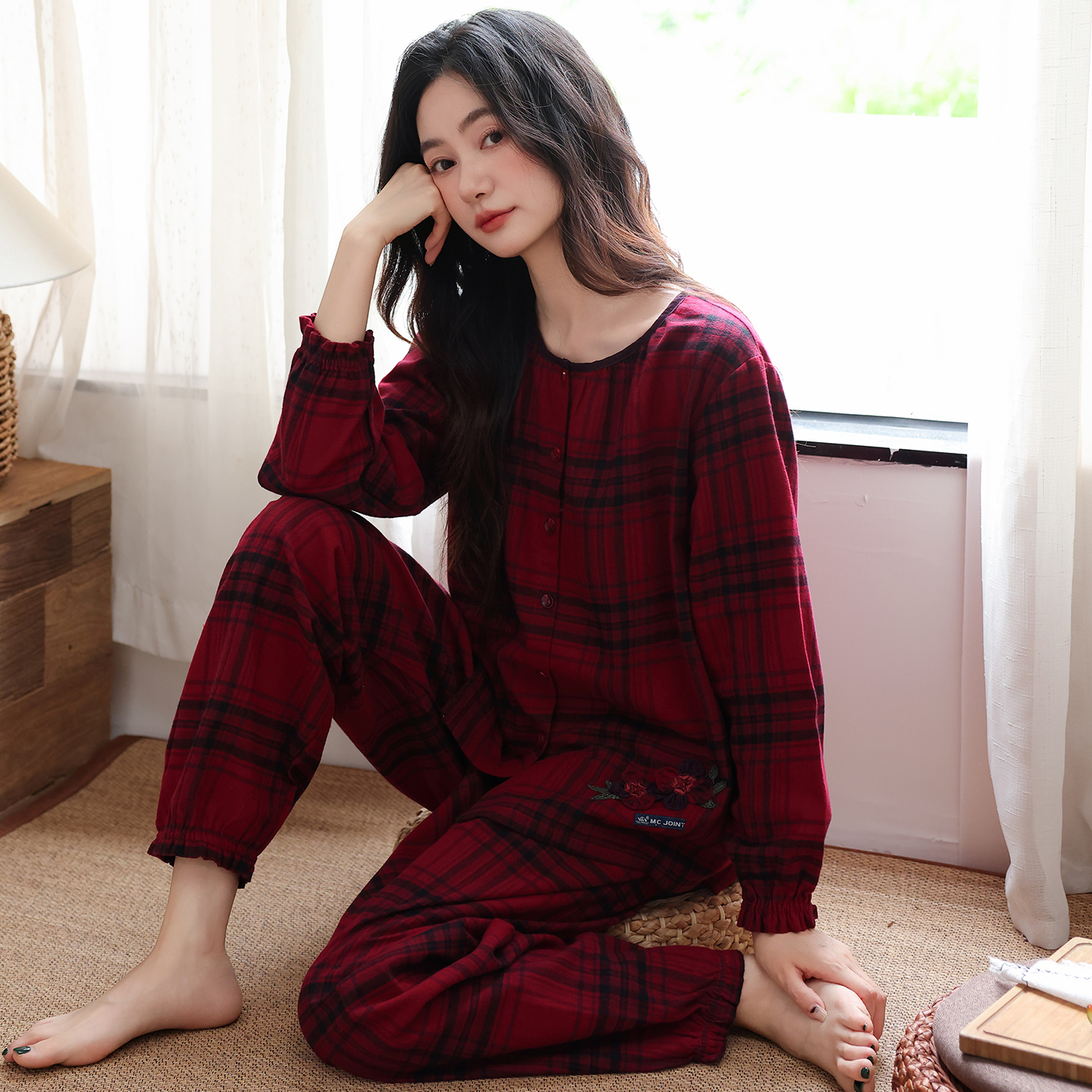 红色格子家居服套装 梭织棉纱布睡衣女春秋款 全棉薄款 秋季 纯棉长袖