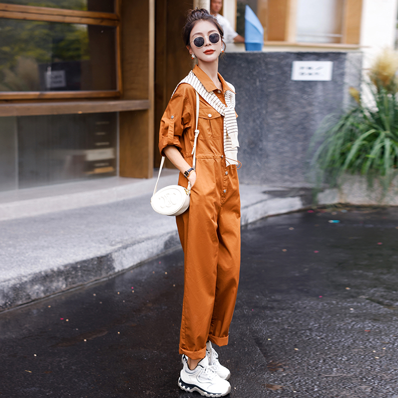 长裤 条纹披肩收腰连体衣牛仔棉布工装 子 女春秋新款 今年流行连体裤