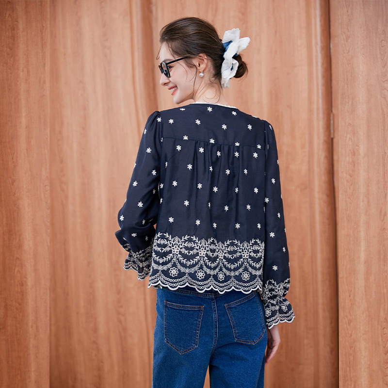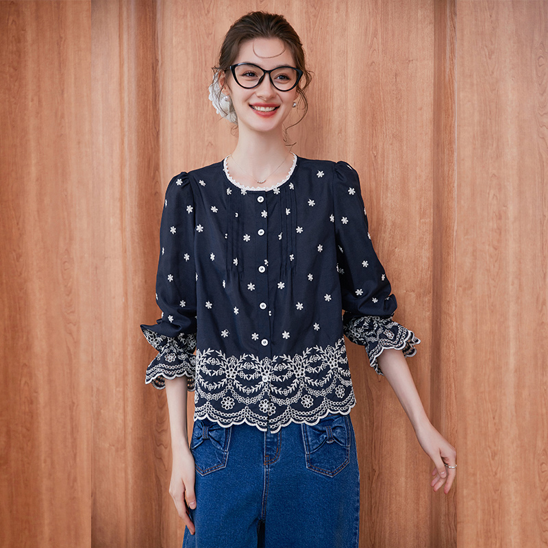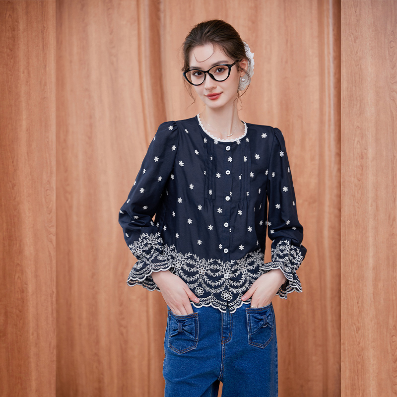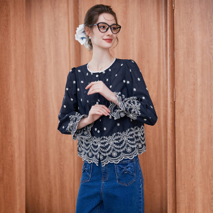 法式 新款 刺绣木耳边立领全棉衬衣独特超好看上衣 女2025秋季 白衬衫