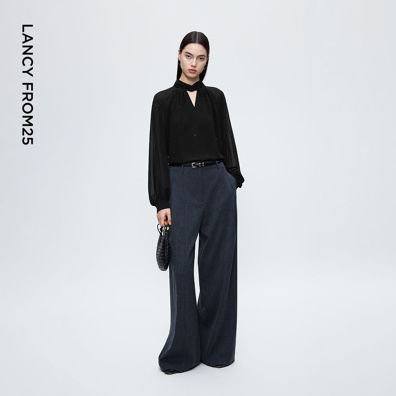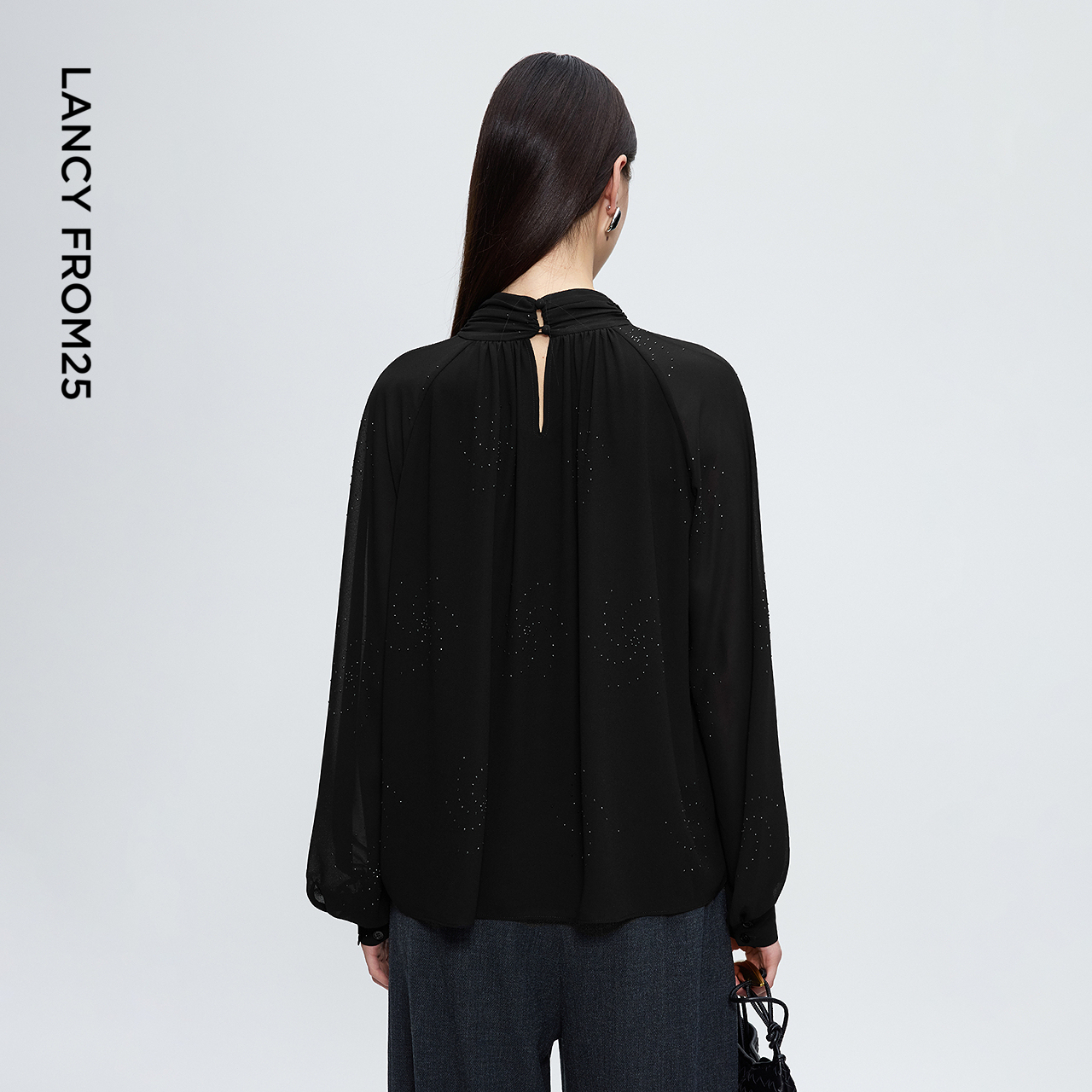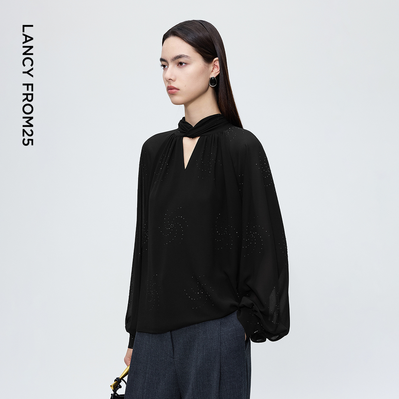 免定金 2025年冬季 朗姿设计感时尚 黑色衬衫 新款 上衣灯笼袖