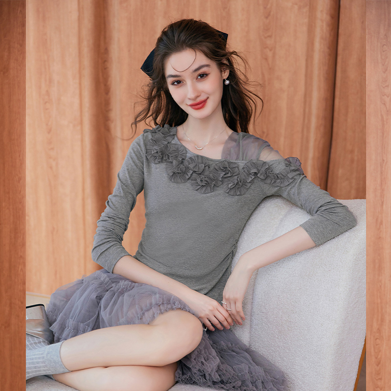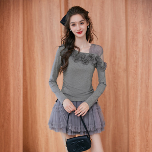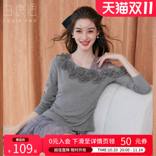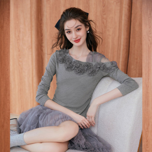 设计感显瘦打底洋气上衣 T恤25秋新款 白鹿语法式 甜美花边拼接修身