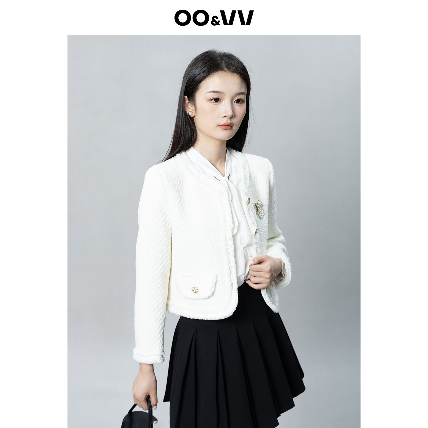 oo&vv黑色小香风外套女秋新气质百搭设计别致正肩复古开衫 羊毛呢