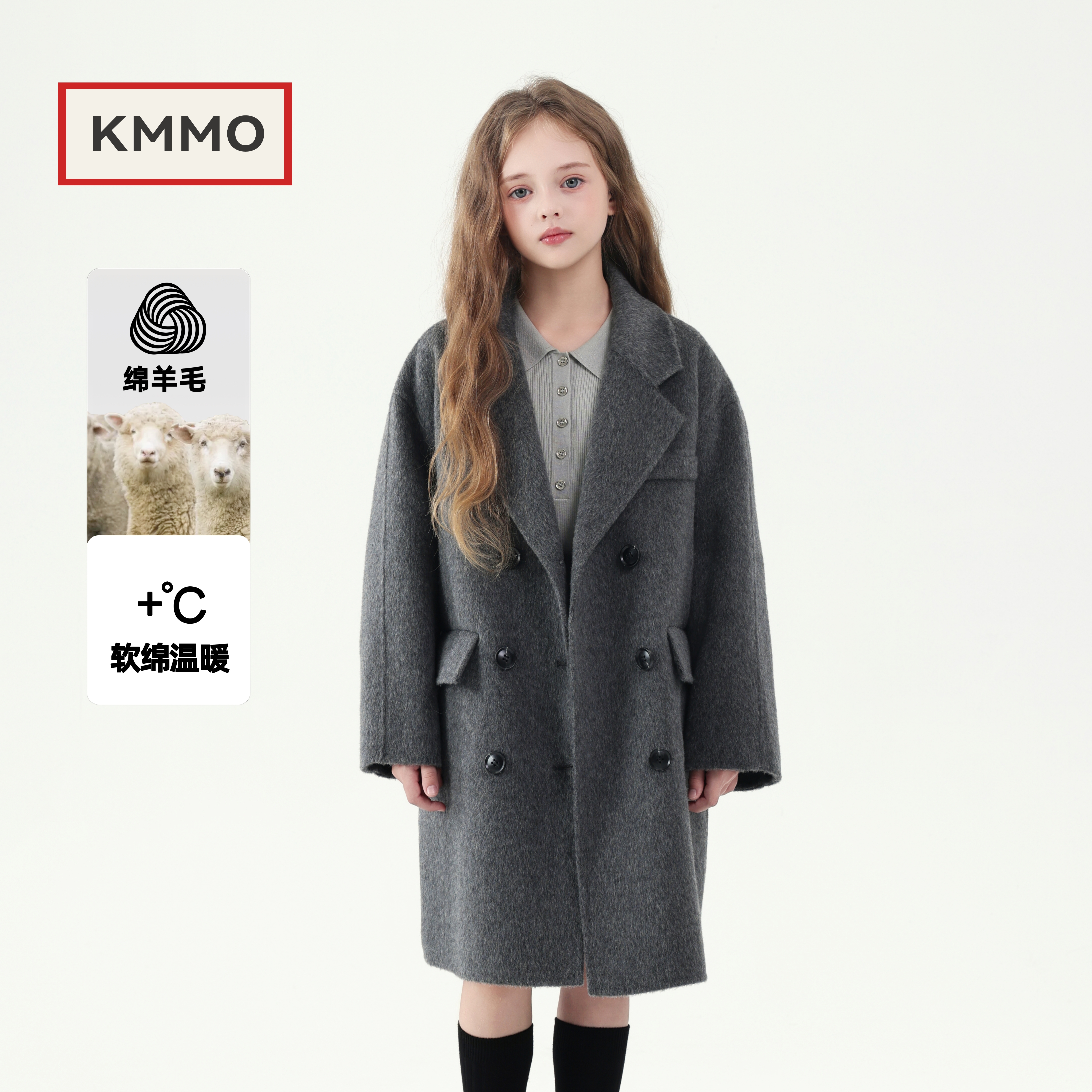 加绒加厚 儿童呢子外套中长款 KMMO女童双面羊绒大衣2025秋冬季 新款