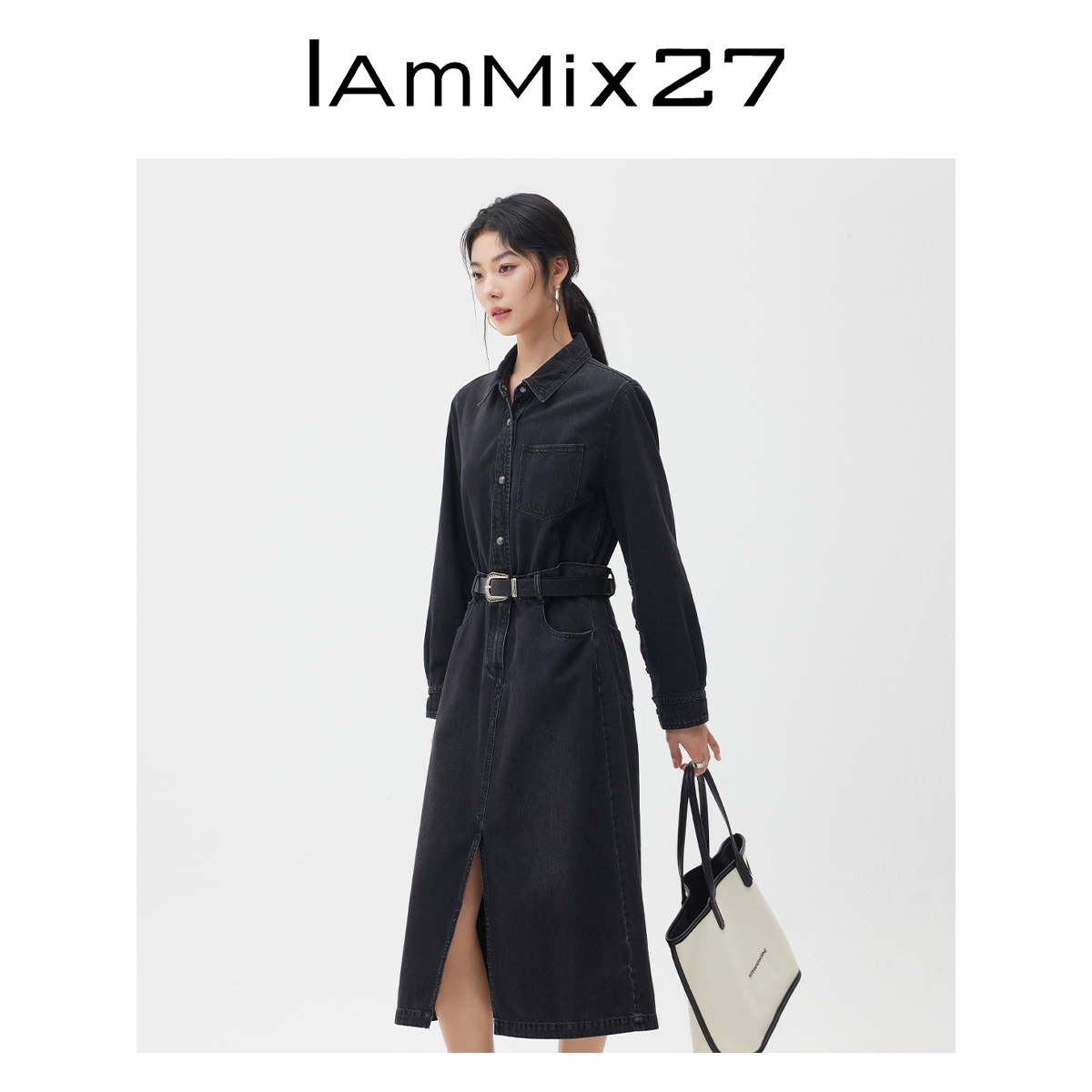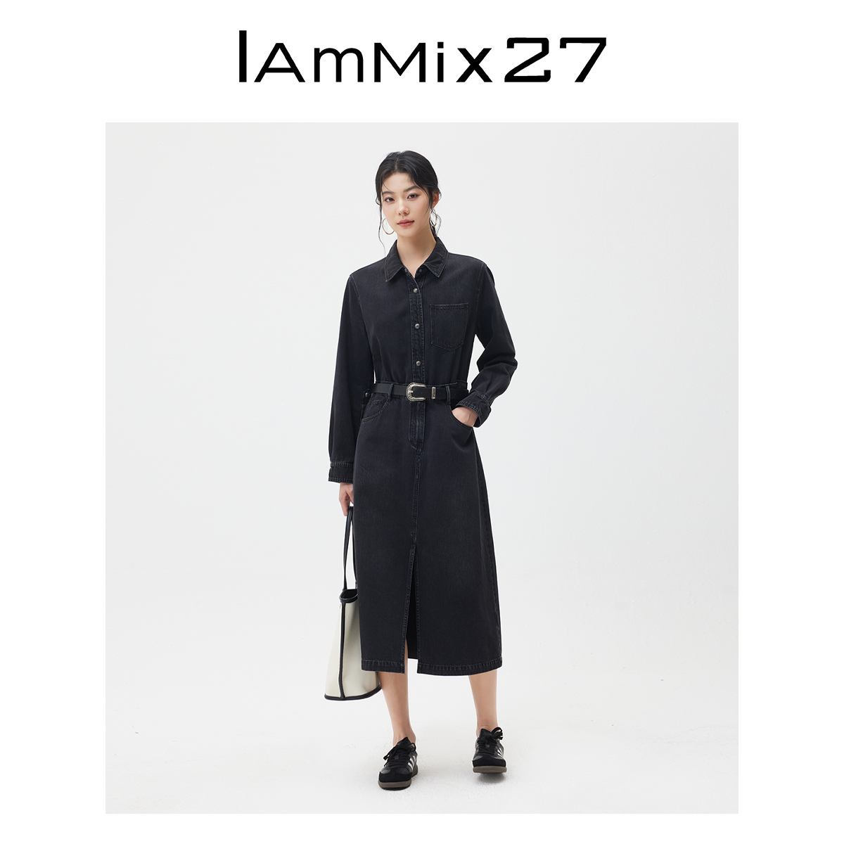 IAmMIX27春秋牛仔连衣裙女长袖 显瘦纯色百搭简约休闲连体长裙 修身