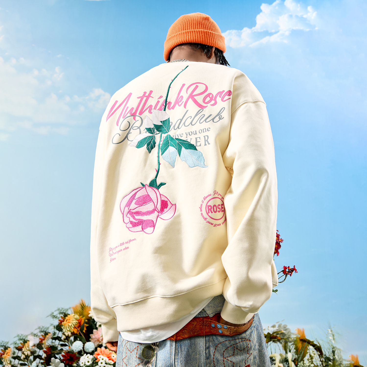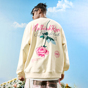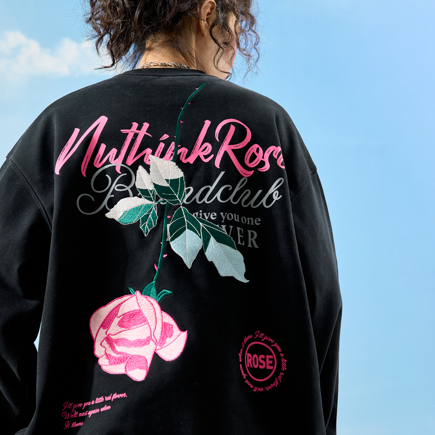 Nuthink美式 潮牌字母玫瑰花重磅刺绣圆领卫衣外套男女2025秋新款