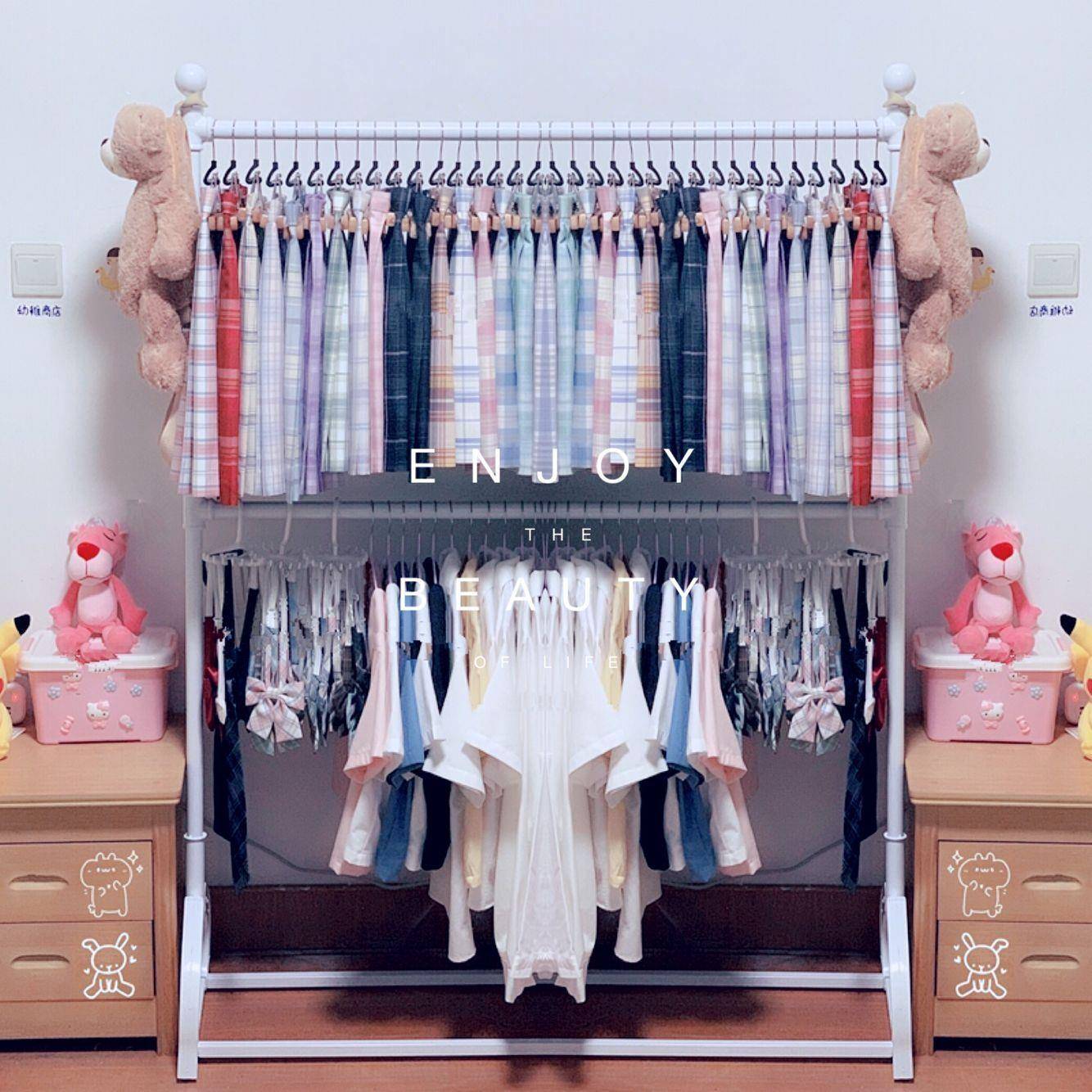 双杆式 衣帽架置地卧室阳台简易伸缩晾晒衣架jk制服双层升降收纳架