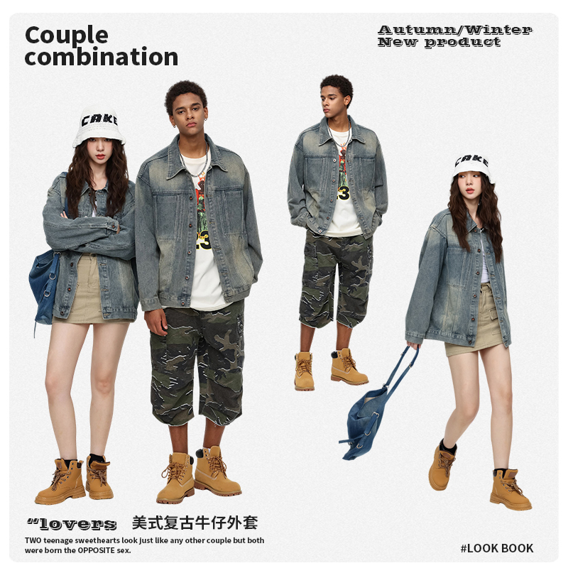 唐狮2025秋季 牛仔外套女巴恩风复古做旧潮牌宽松撞色翻领夹克 新款