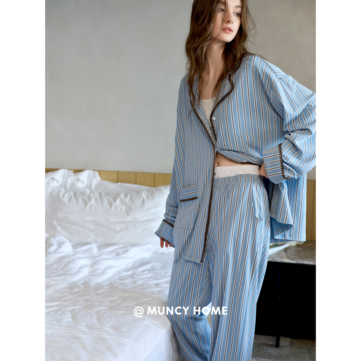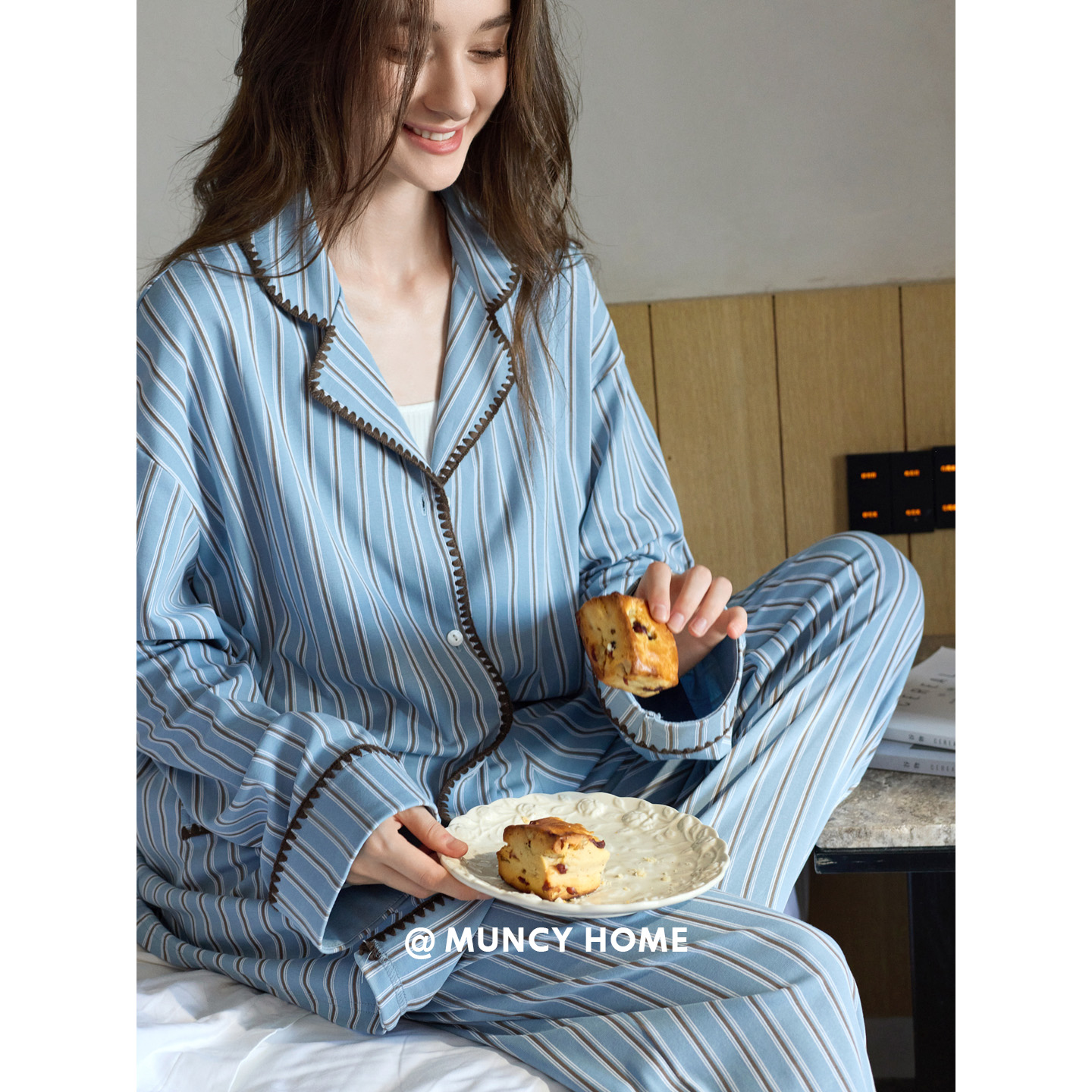 宽松气质条纹可外穿套装 柔软棉春秋睡衣女长袖 蓝色贝壳绣 曼系
