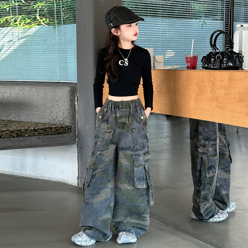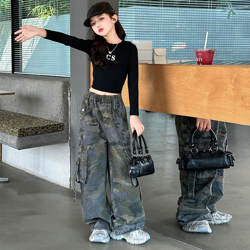 裤 女童爵士舞潮酷套装 T迷彩工装 酷帅街舞长袖 2025中大童辣妹秋装
