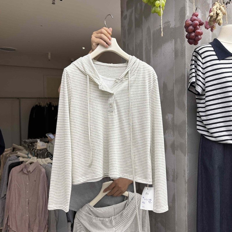 洋气上衣 T恤女圆领正肩气质小衫 2025秋季 韩系连帽假两件条纹长袖