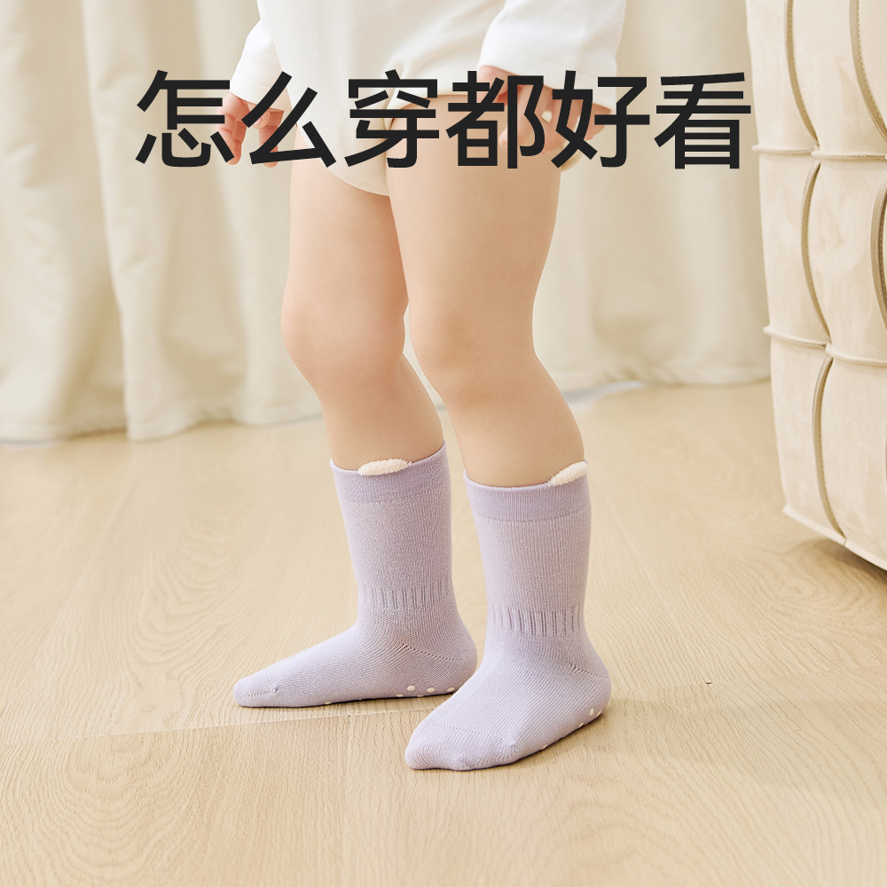 小龙人100%纯棉无骨女宝宝地板袜秋冬款 防滑隔凉室内学步婴儿袜子