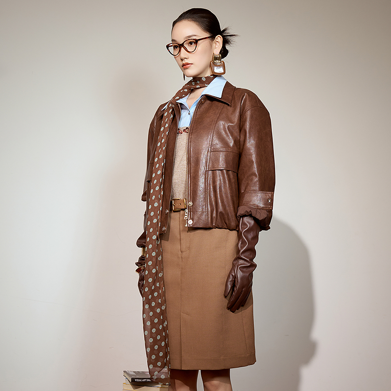 皮衣外套女MGFG135123 港风复古直筒长袖 曼诺比菲商场同款 2025秋季