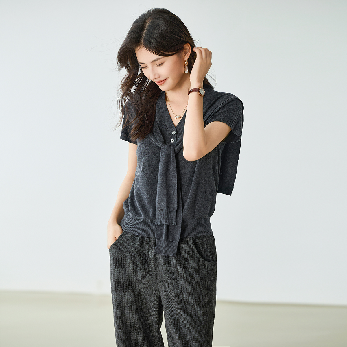 针织衫 条纹短袖 长袖 开衫 毛衣外套 RARN2025秋装 两件套圆领修身 新款