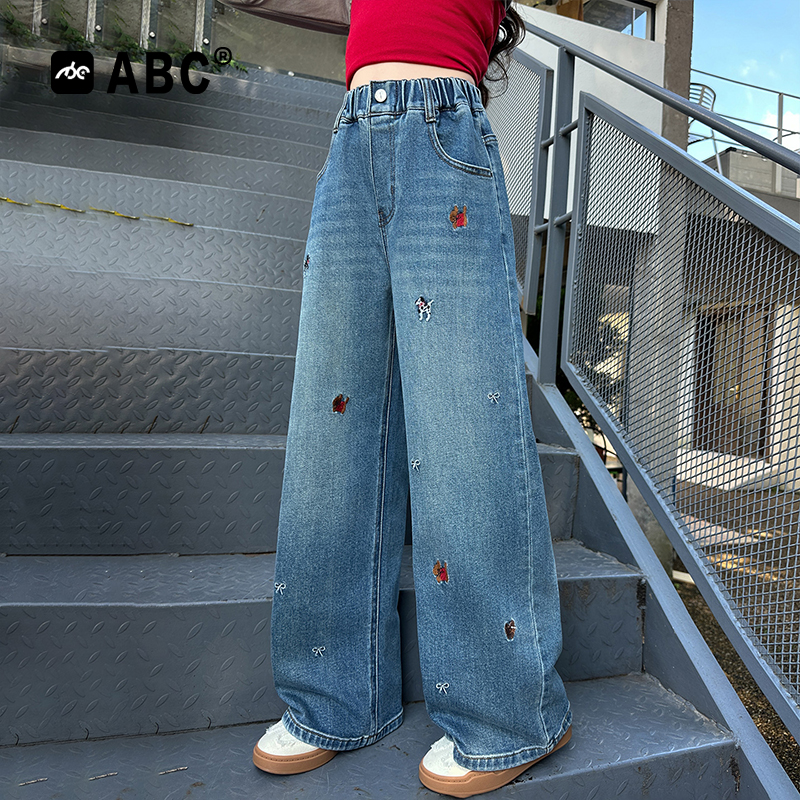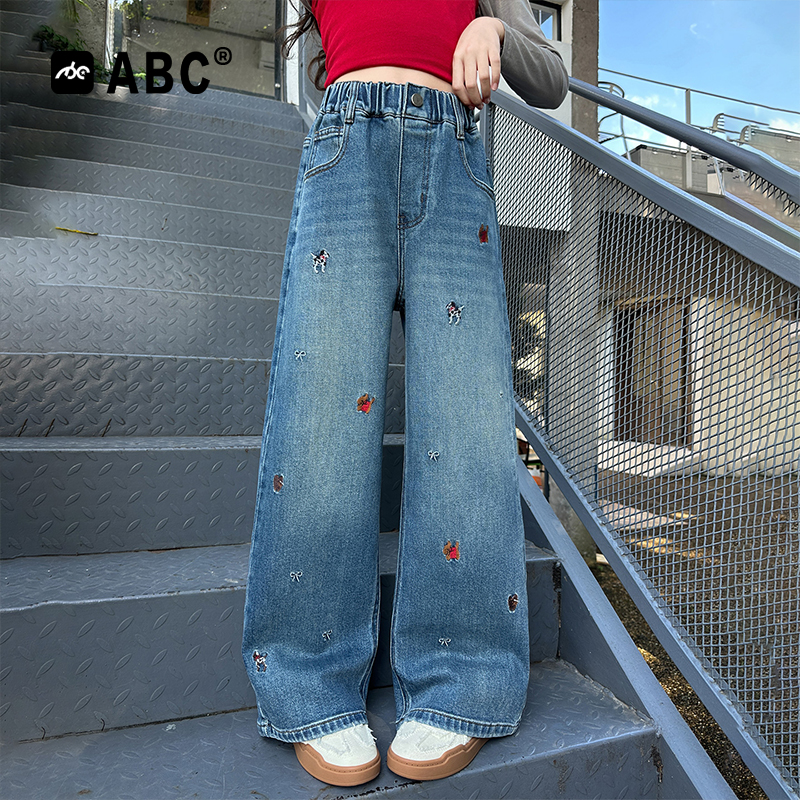 女大童潮流直筒裤 女孩卡通刺绣阔腿裤 2025新款 ABC女童春秋牛仔裤