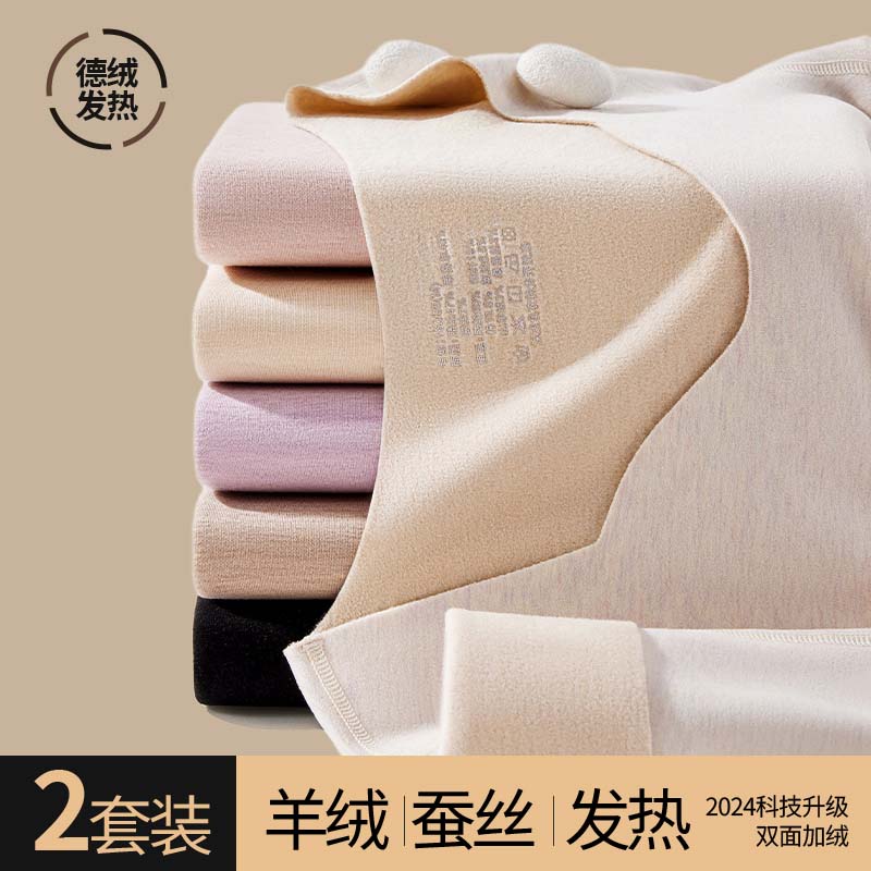 上衣磨毛 加绒加厚羊毛蚕丝秋衣秋裤 德绒保暖内衣女士套装 秋冬季