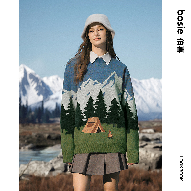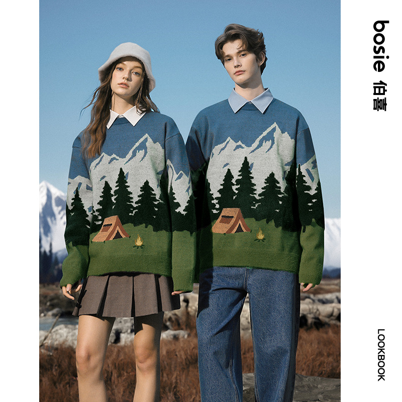 男情侣休闲针织衫 露营户外风景提花毛衫 新款 bosie伯喜2025年秋季