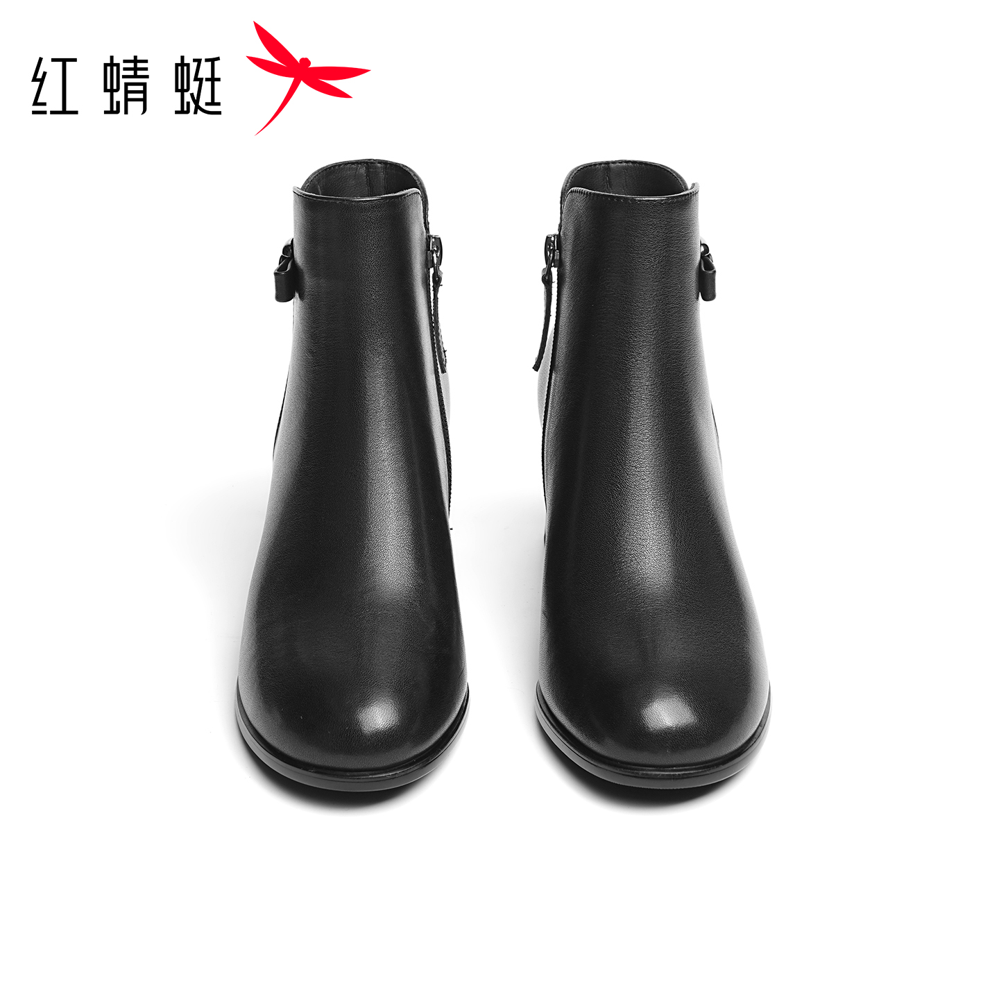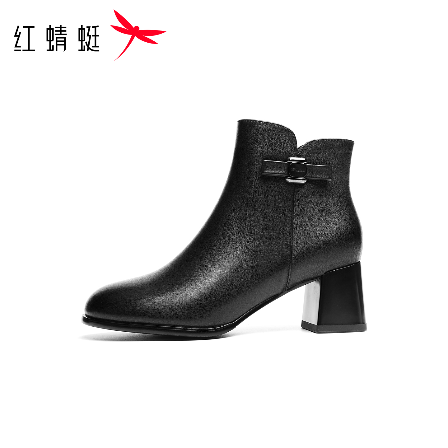 黑色气质妈妈高跟靴子 皮靴加绒皮鞋 红蜻蜓短靴女2025秋冬新款 女鞋