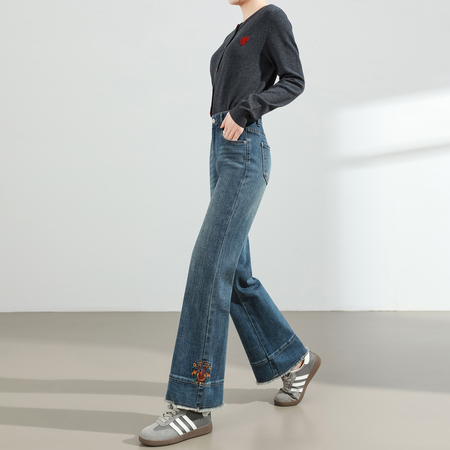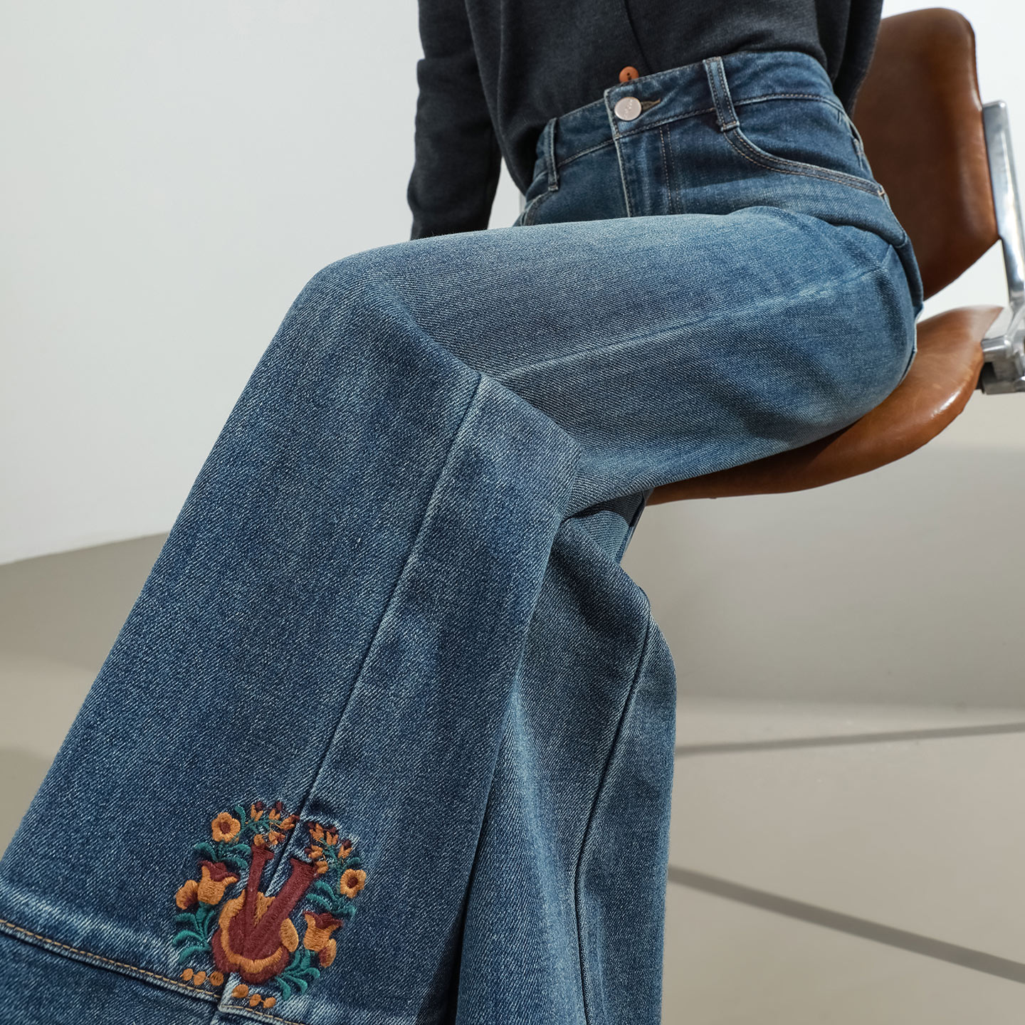 国风高腰宽松阔腿喇叭裤 刺绣微喇牛仔裤 复古毛边新中式 新款 女秋季