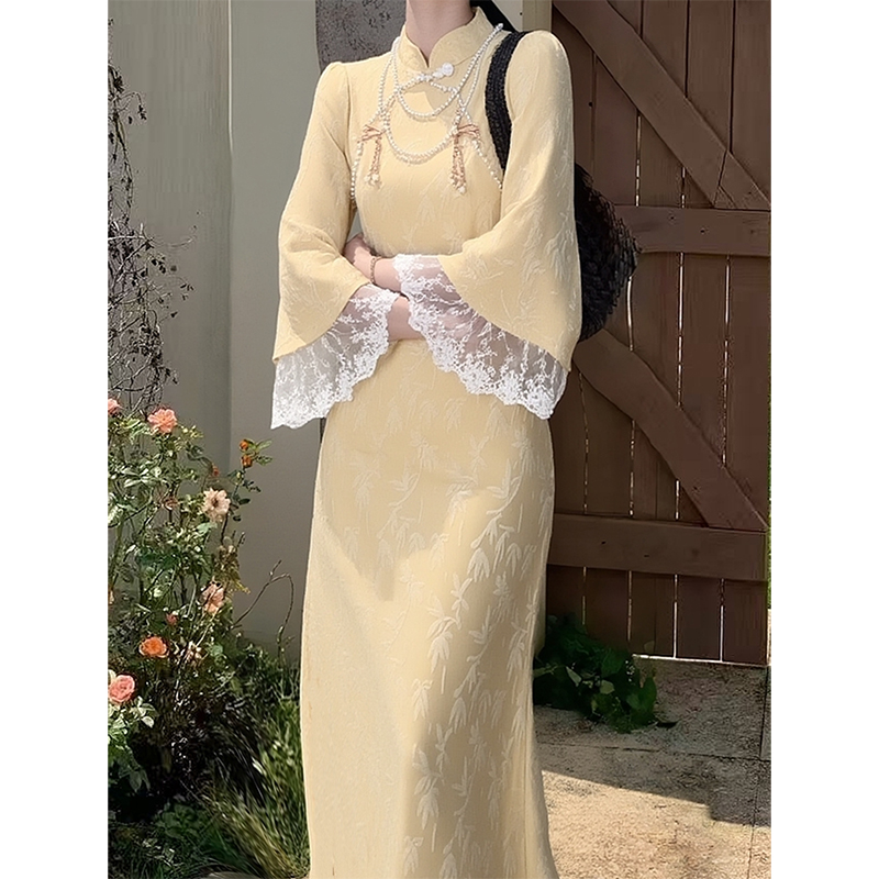 栀花清梦 杏色立领盘扣旗袍连衣裙开衫 早秋季 新中式 女 新款 乔拉