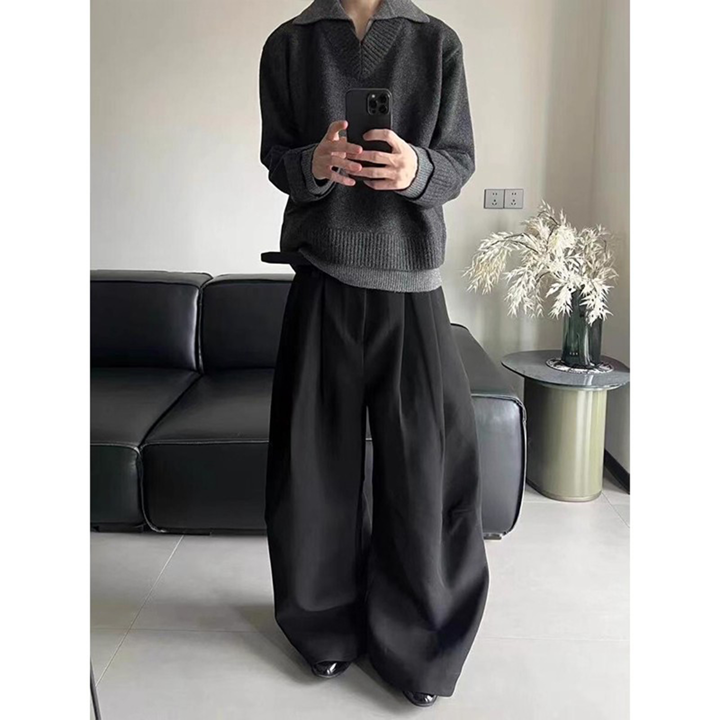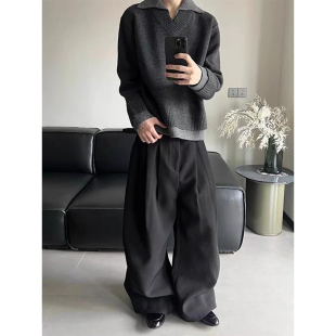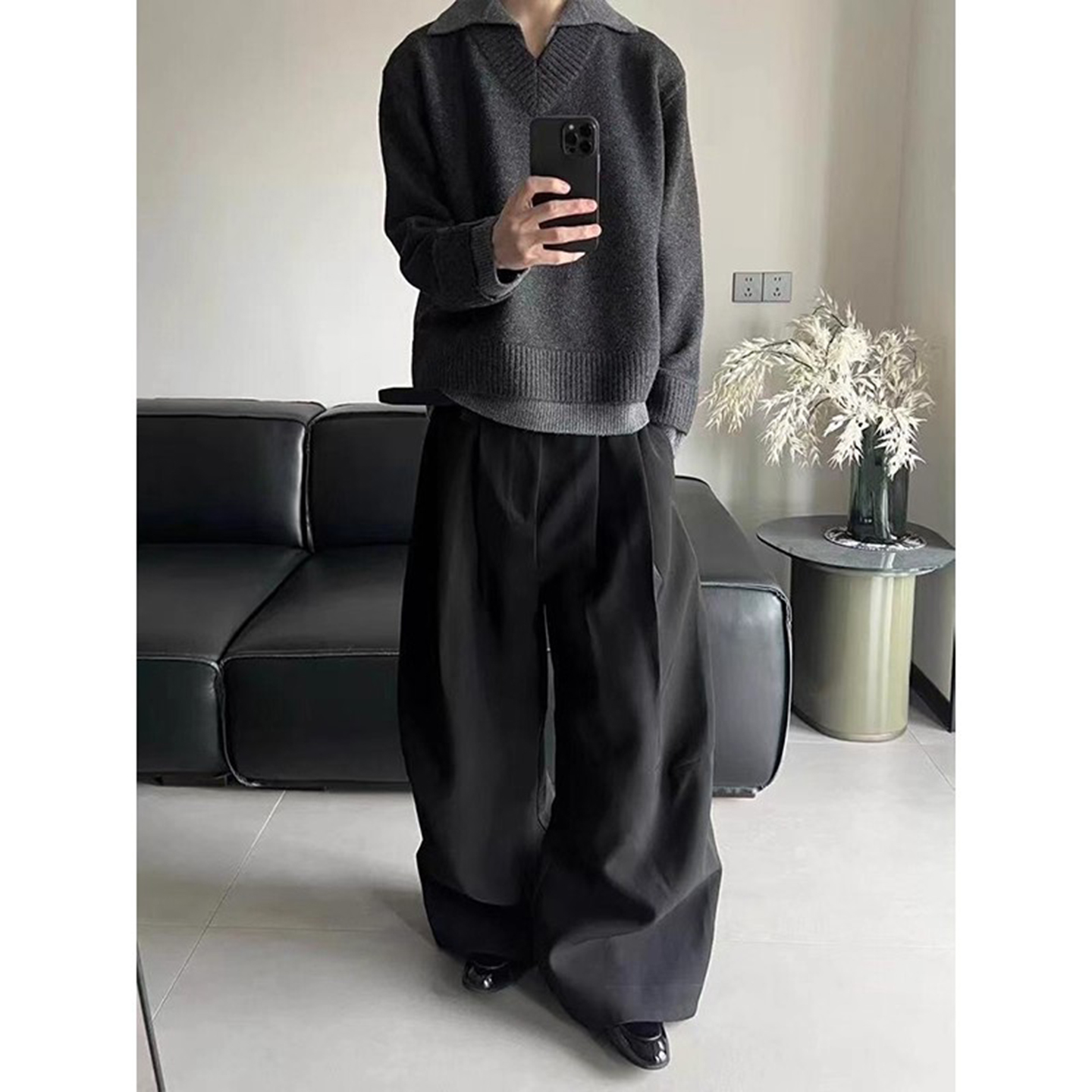 慵懒风针织打底衫 cleanfit灰色POLO衫 复古假两件V领毛衣男款 美式