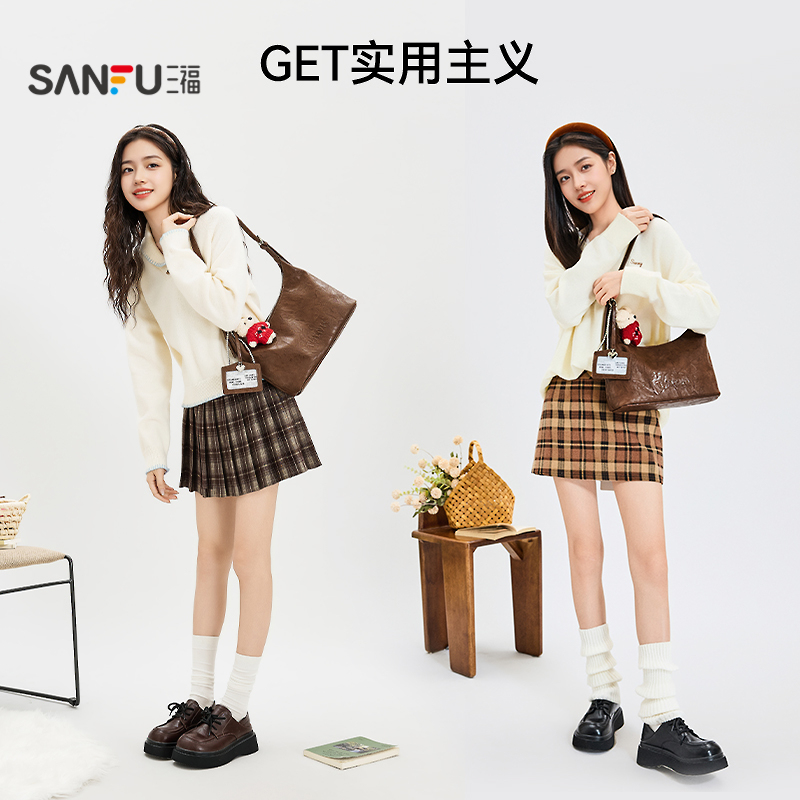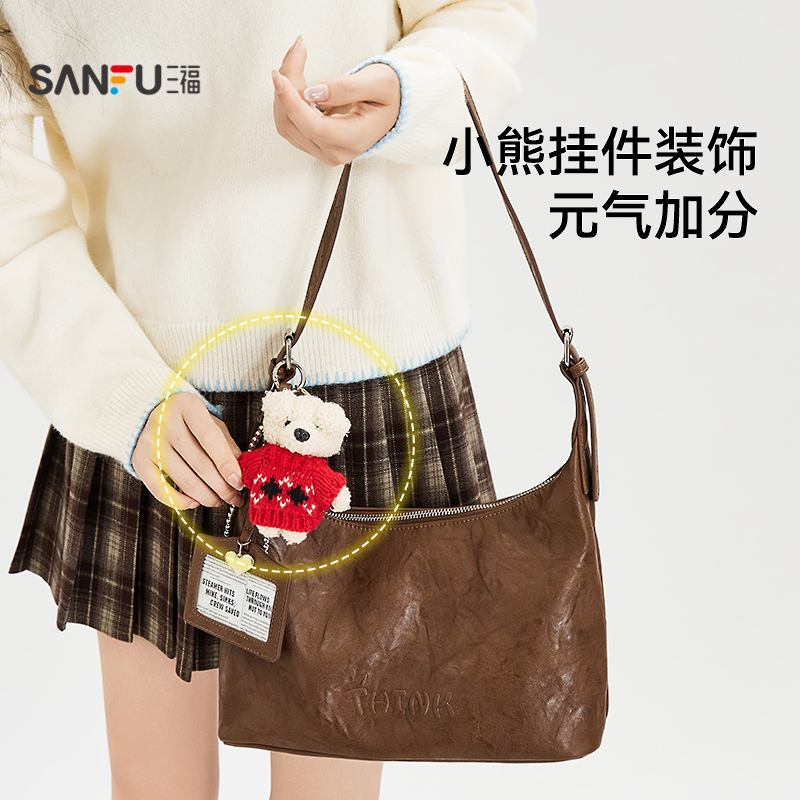 三福挎包秋季 学院风纯色小熊挂件hobo包单肩包女包508713
