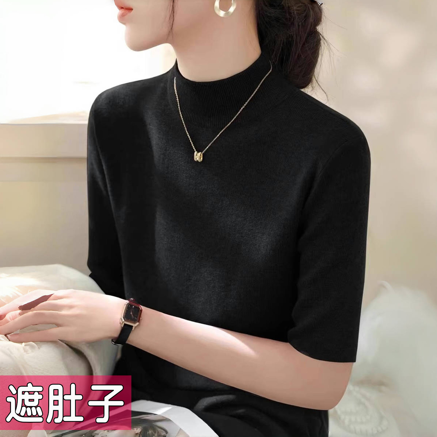 内搭上衣中袖 大码 毛衣女短袖 针织打底衫 t恤胖mm春秋 半高领五分袖