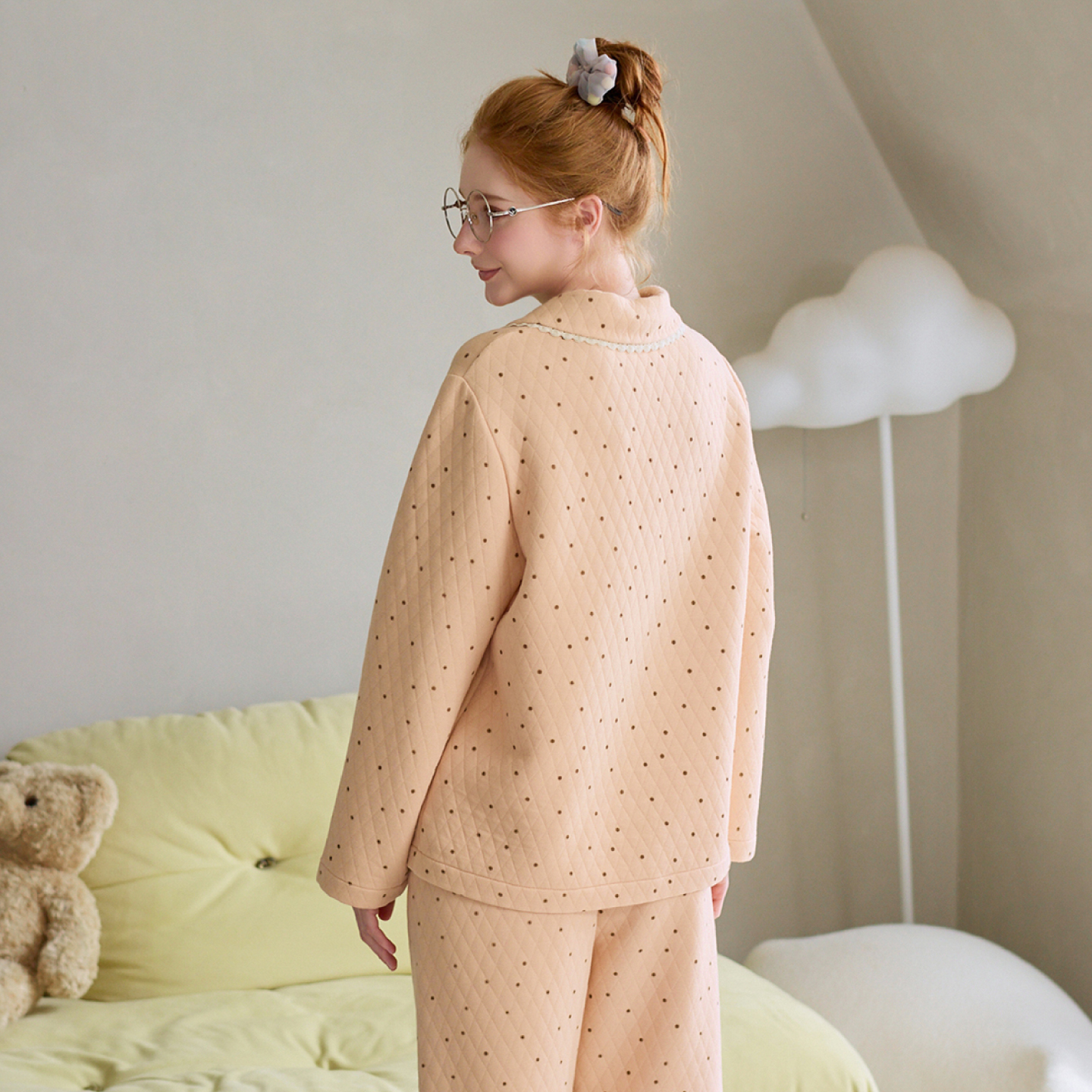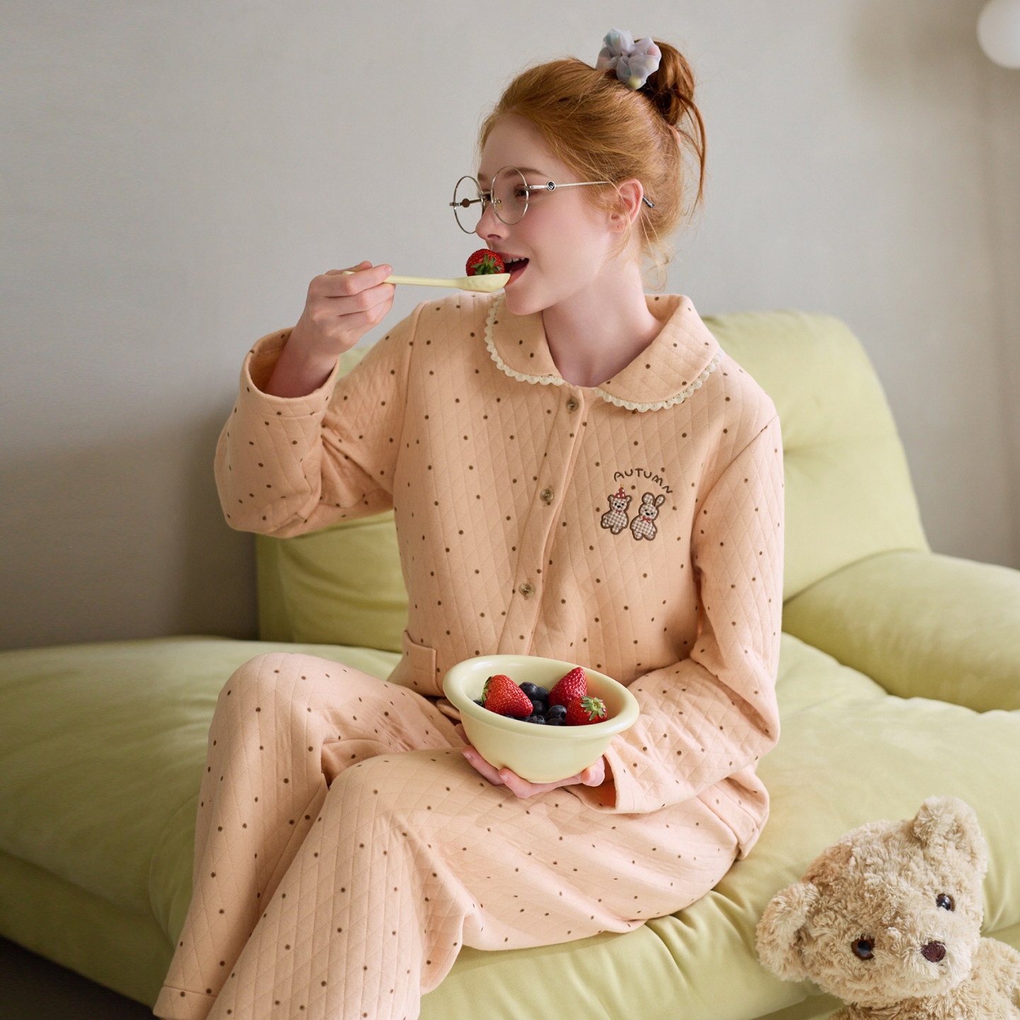 夹棉纯棉可外穿家居服套装 夹层薄款 空气棉长袖 芬腾睡衣女秋冬季