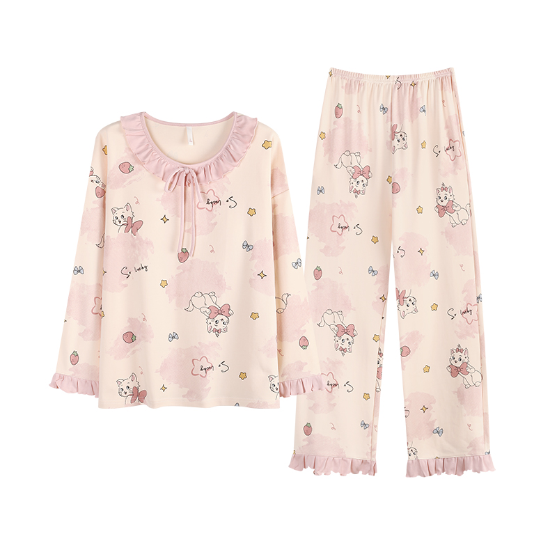 甜美可爱卡通带胸垫家居服套装 2025新款 长袖 猫人纯棉睡衣女春秋季