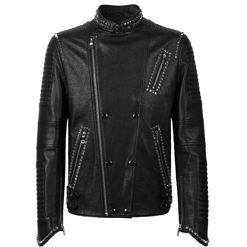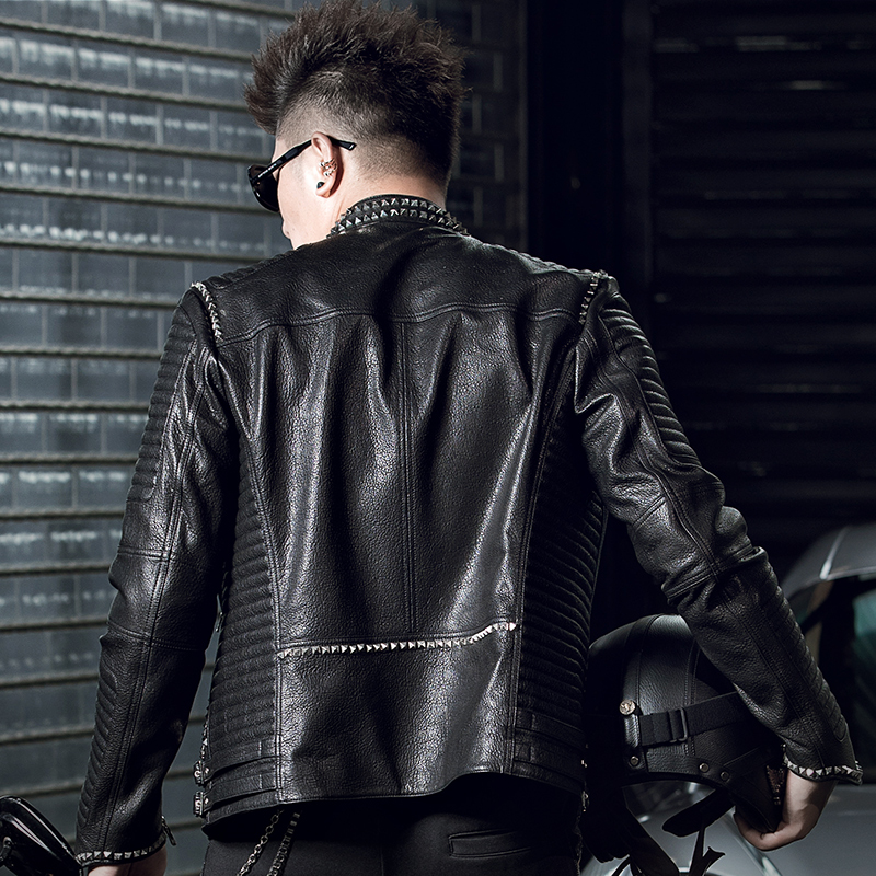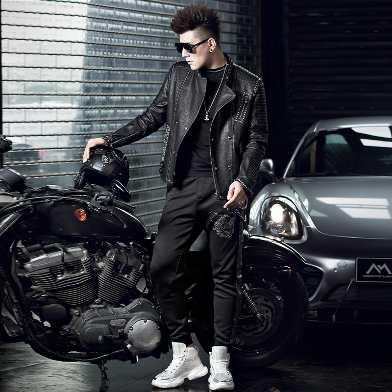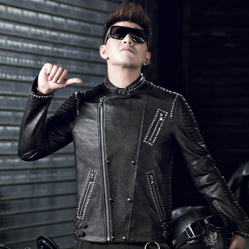皮夹克男士 欧美铆钉立领修身 外套潮 新款 SXF圣希梵海宁皮衣男真皮
