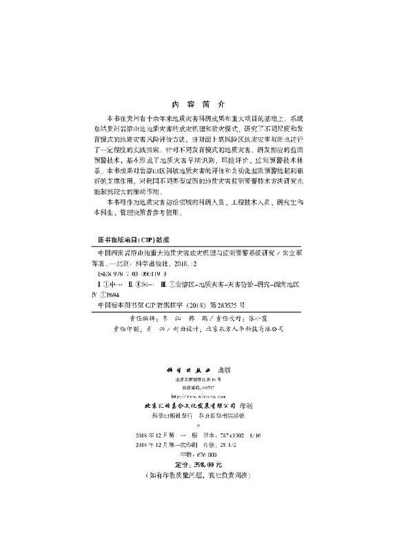 科学出版 中国西南岩溶山地重大地质灾害成灾机制与监测预警系统研究 著 等 社 朱立军