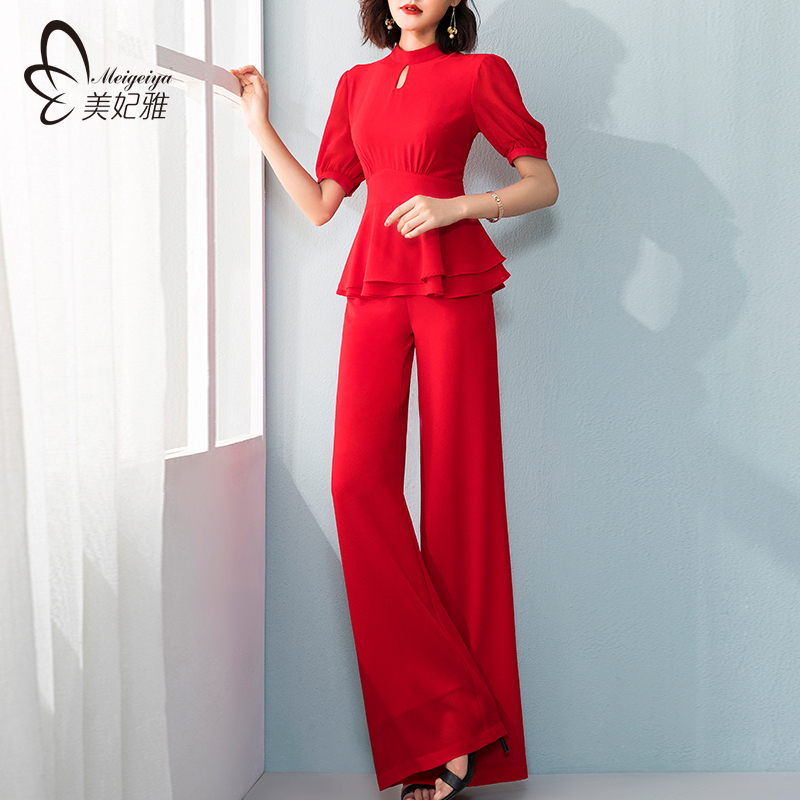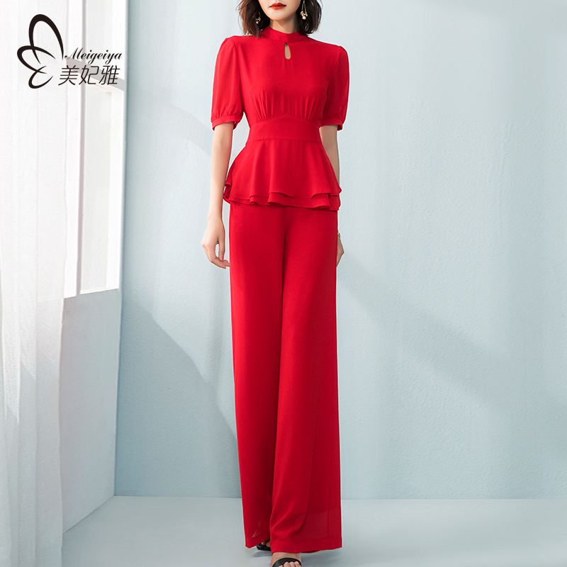 职业气质女神范衣服套装 美妃雅红色雪纺阔腿裤 两件套女秋2025新款