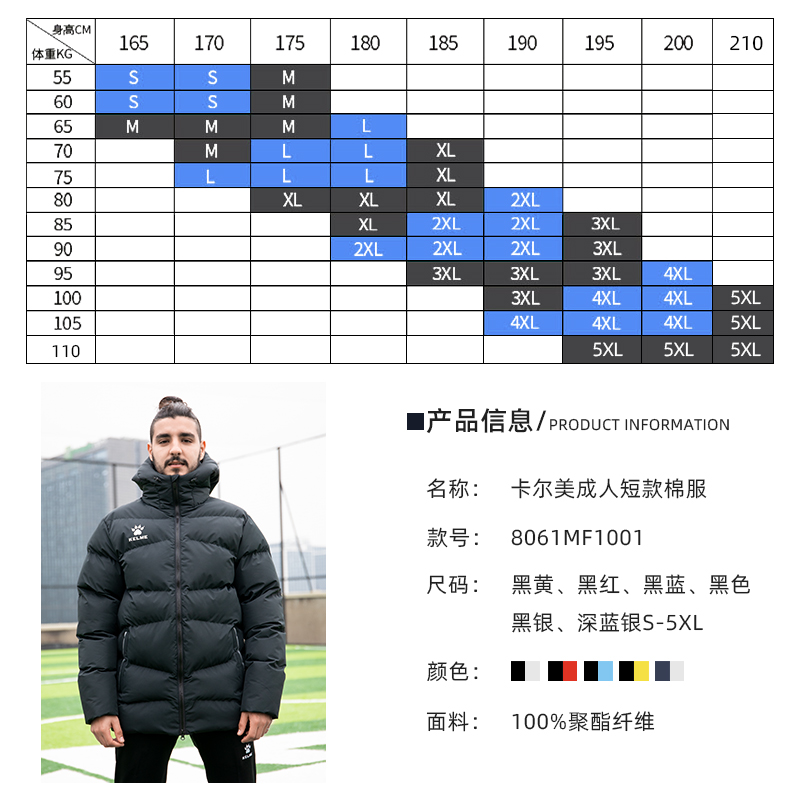 棉服 加厚中短款 KELME卡尔美防风连帽拉链款 运动保暖棉衣男女冬季
