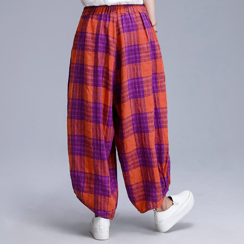 格子休闲九分哈伦裤 布琳达2024夏季 女宽松大码 亚麻阔腿灯笼裤 薄款