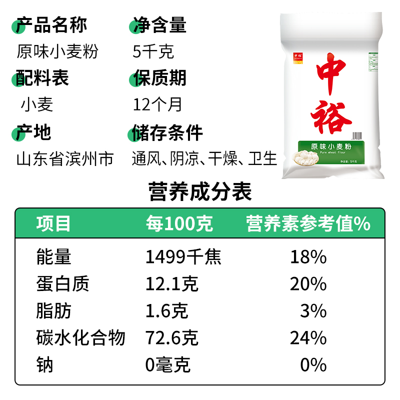 中裕面粉 5kg原味小麦粉包子食品美食通用中筋家用原味粉中筋粉