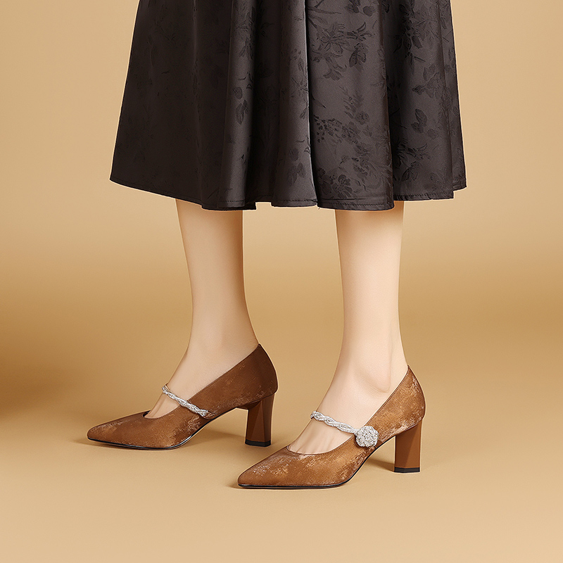 舒适气质粗跟高跟鞋 水钻一字扣带尖头浅口高跟单鞋 女 新款 2025春季