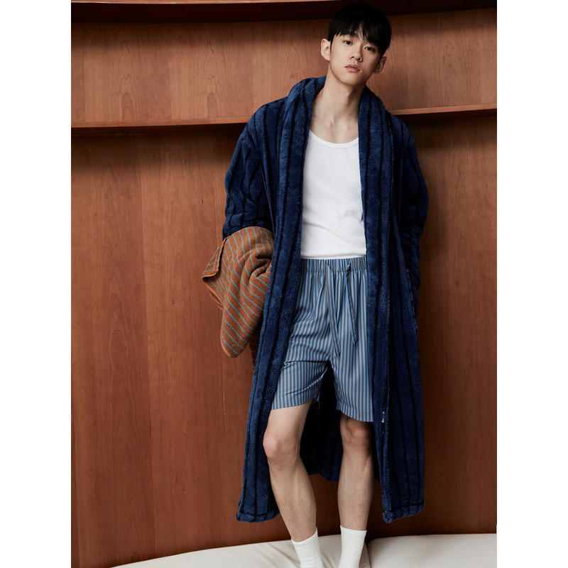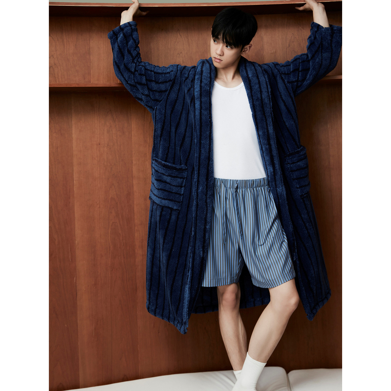 GXG男士 蓝黑条纹翻领睡袍加厚宽松上衣保暖 家居服外套