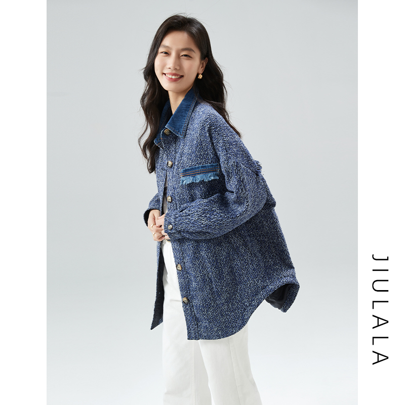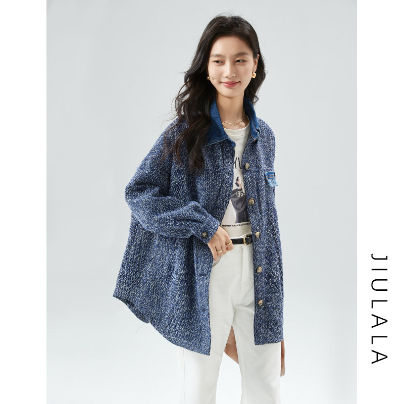 POLO领长袖 新款 百搭休闲宽松显瘦外套潮 女2025秋装 藏青色拼接衬衫