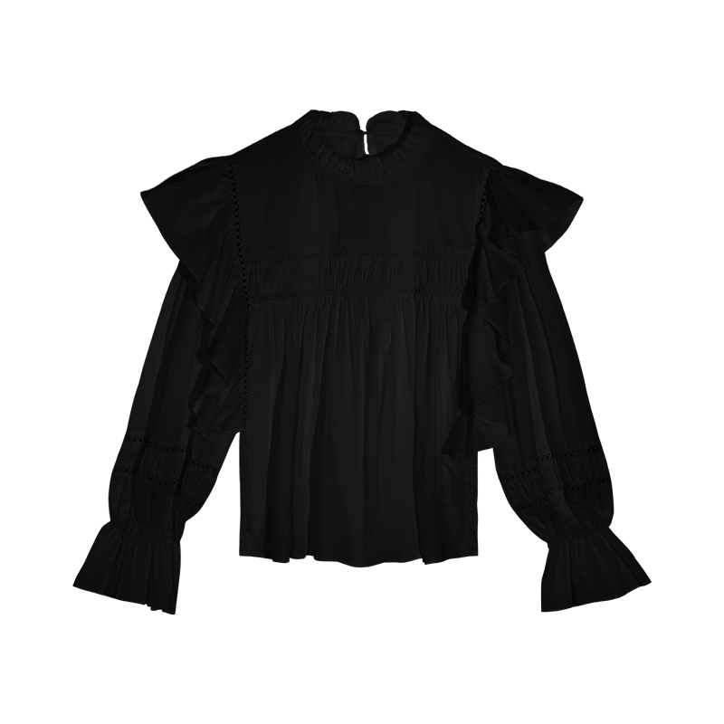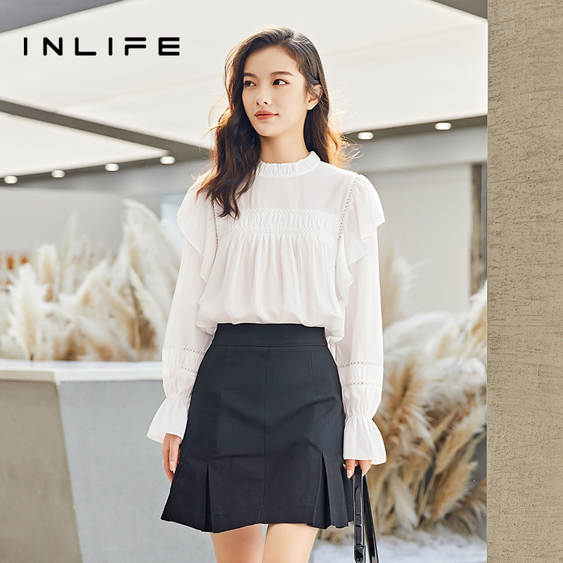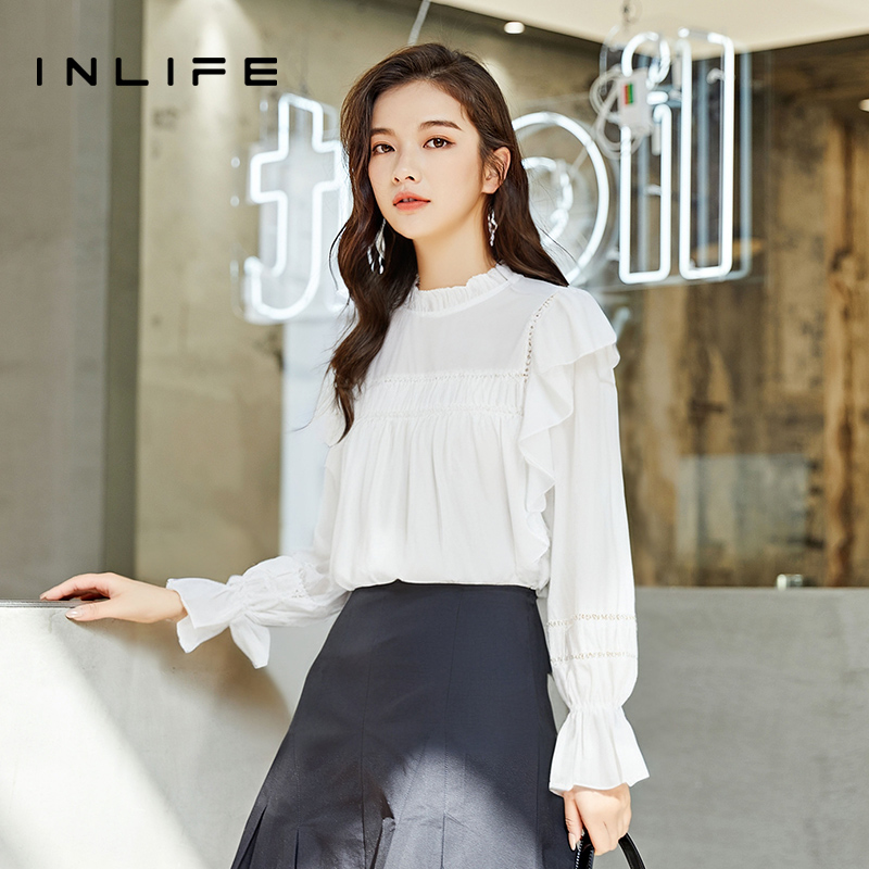 COCOBELLA名媛风手工压褶木耳边雪纺衬衫 气质通勤飘带衬衣SR7062